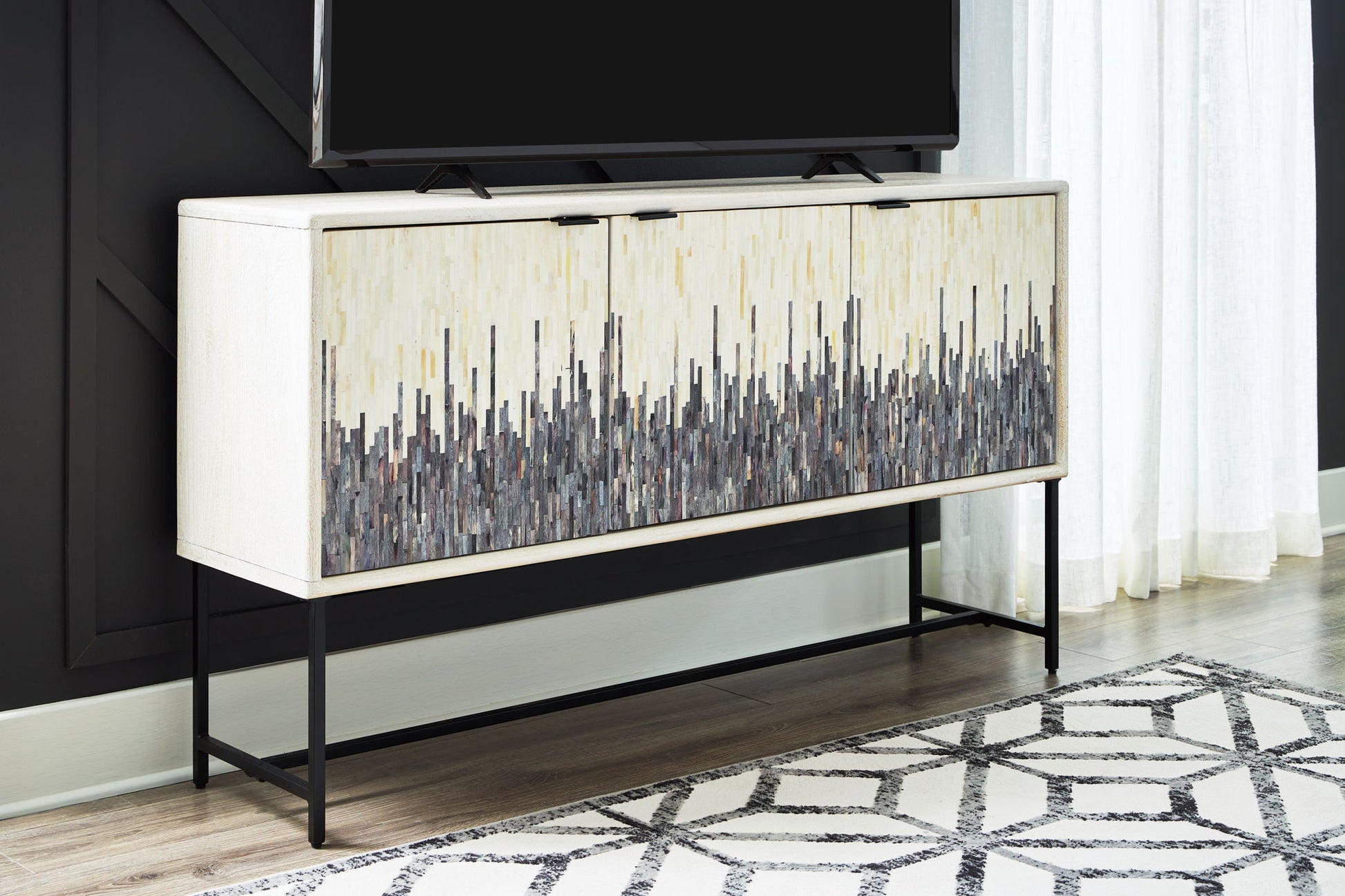 Looking for a showstopping accent for your home? This accent cabinet combines fashion and function in an exclusive way. It offers a creative take on a traditional cabinet, with a strip pattern in white, gray and black. Inside the doors, two shelves suit all your storage needs. Redefine your modern decor with this one-of-a-kind piece.