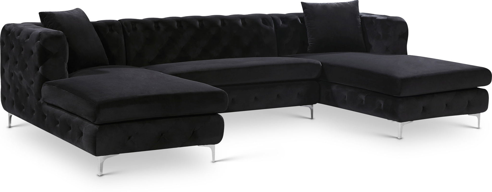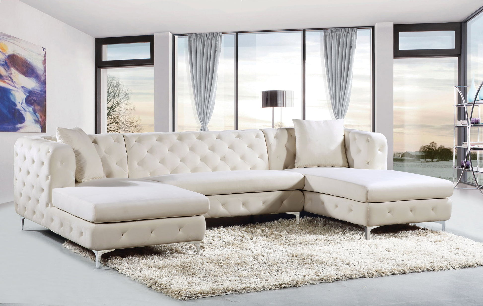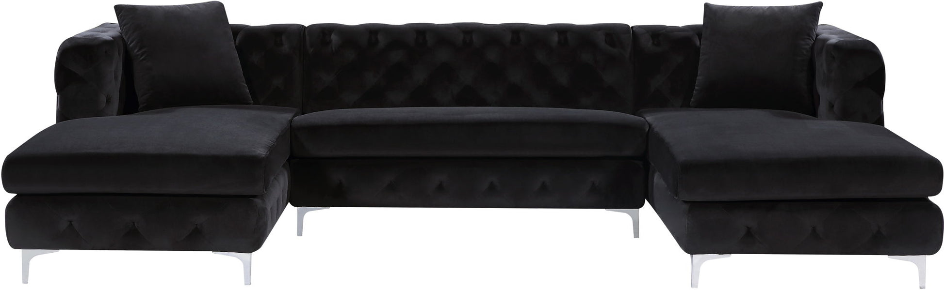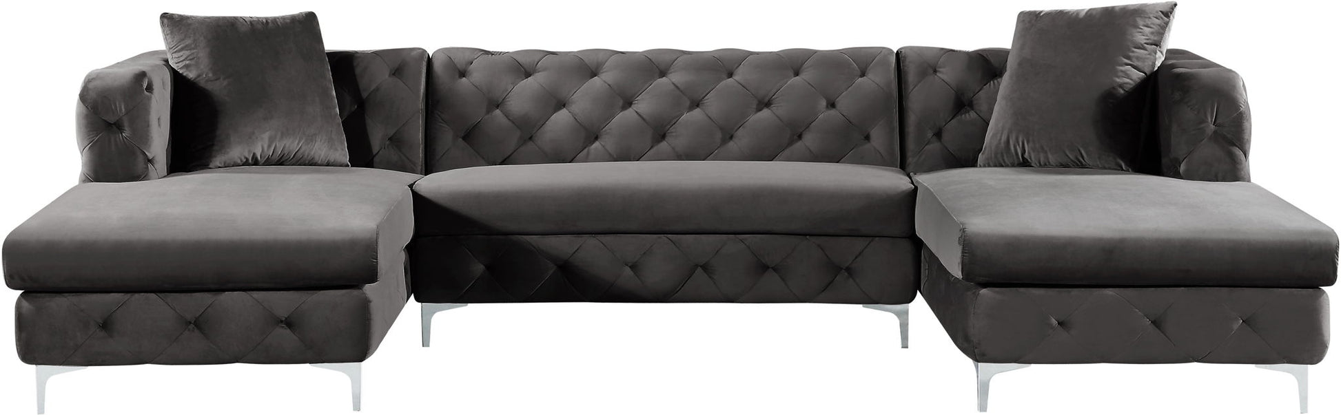 Bring fine living to the forefront with this Gail sectional. This-colored sectional features two chaise ends, giving you the room you need to snuggle up and get comfortable on movie night. The upholstery is made from velvet and simply luxurious to the touch. Deep tufting all over the backs and sides of this unit add to its glamorous vibe, while thed legs finish off the design on a modern note. This sectional comes with pillows for added comfort and style.