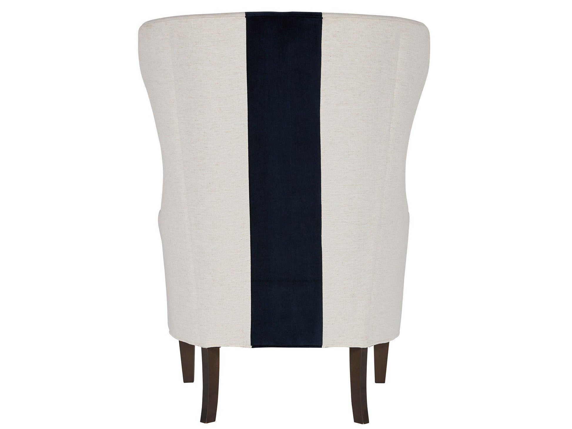 A daring, vertical navy stripe defines the Surfside Wing Chair, a regal upholstery furnishing featuring an exaggerated back and tapered legs.