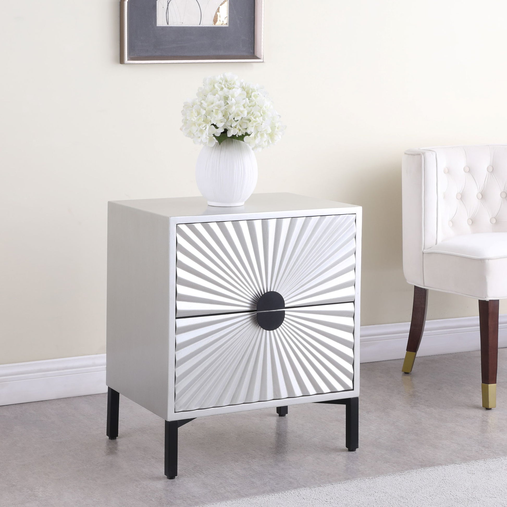 Bring on the glam with this pretty Glitz side table. This elegant table features a starburst design across the panels on its two drawers, making it an eye-catching element for your living room or bedroom space. The shared hardware on the drawers is matte black for a luxe look against the antique silver color palette. Add this attractive side table wherever creating a dramatic effect is the goal.