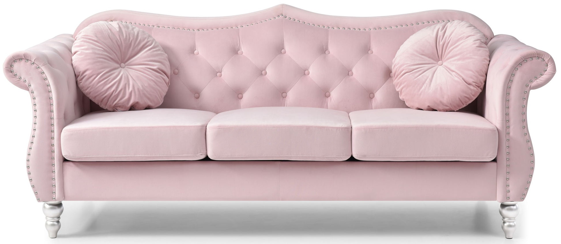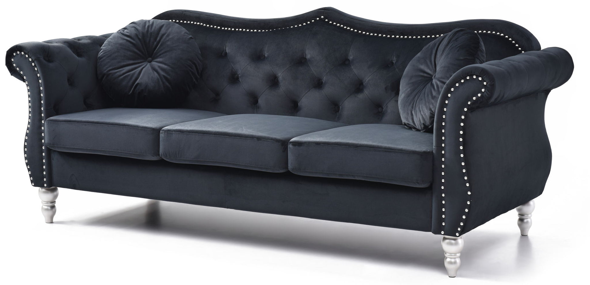 This modern sofa is designed to enhance your living space with unmatched comfort and distinctive style. The deep velvet upholstery presents a contemporary aesthetic that fits well in various decors, while the included throw pillows offer additional relaxation options. With dimensions of 34"H X 82"W X 35"D, it provides ample space for family and friends to enjoy gatherings.