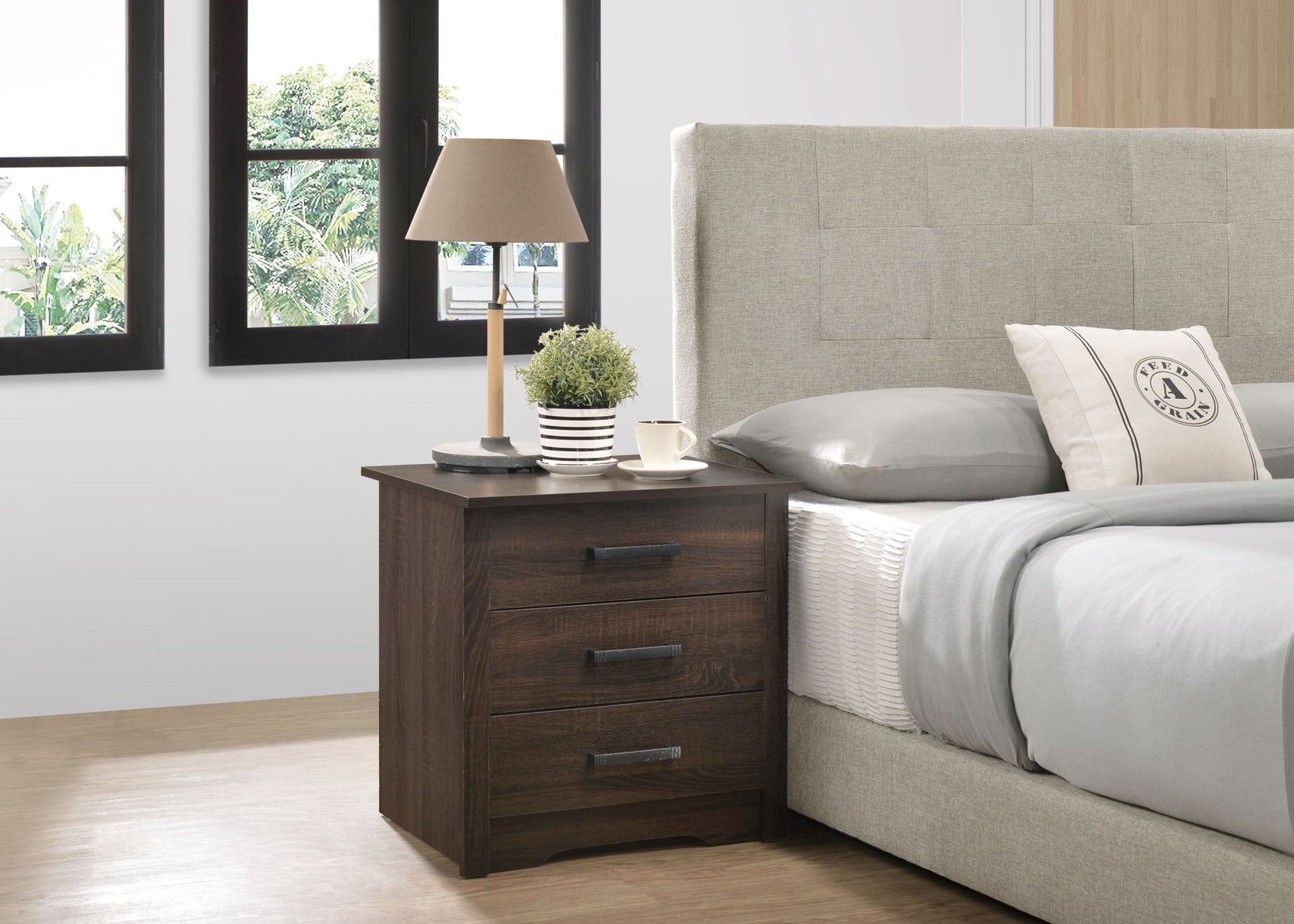 Introducing a functional and stylish piece for any bedroom space. The nightstand features three generously sized drawers for convenient storage, keeping your essentials within reach and organized. Crafted with a sturdy frame and a high-grade laminated finish, it ensures durability alongside a modern transitional design that fits various décor styles. With overall dimensions of 23 inches in height, 22 inches in width, and 18 inches in depth, this nightstand is perfectly suited for limited spaces while providing practical functionality without sacrificing style.