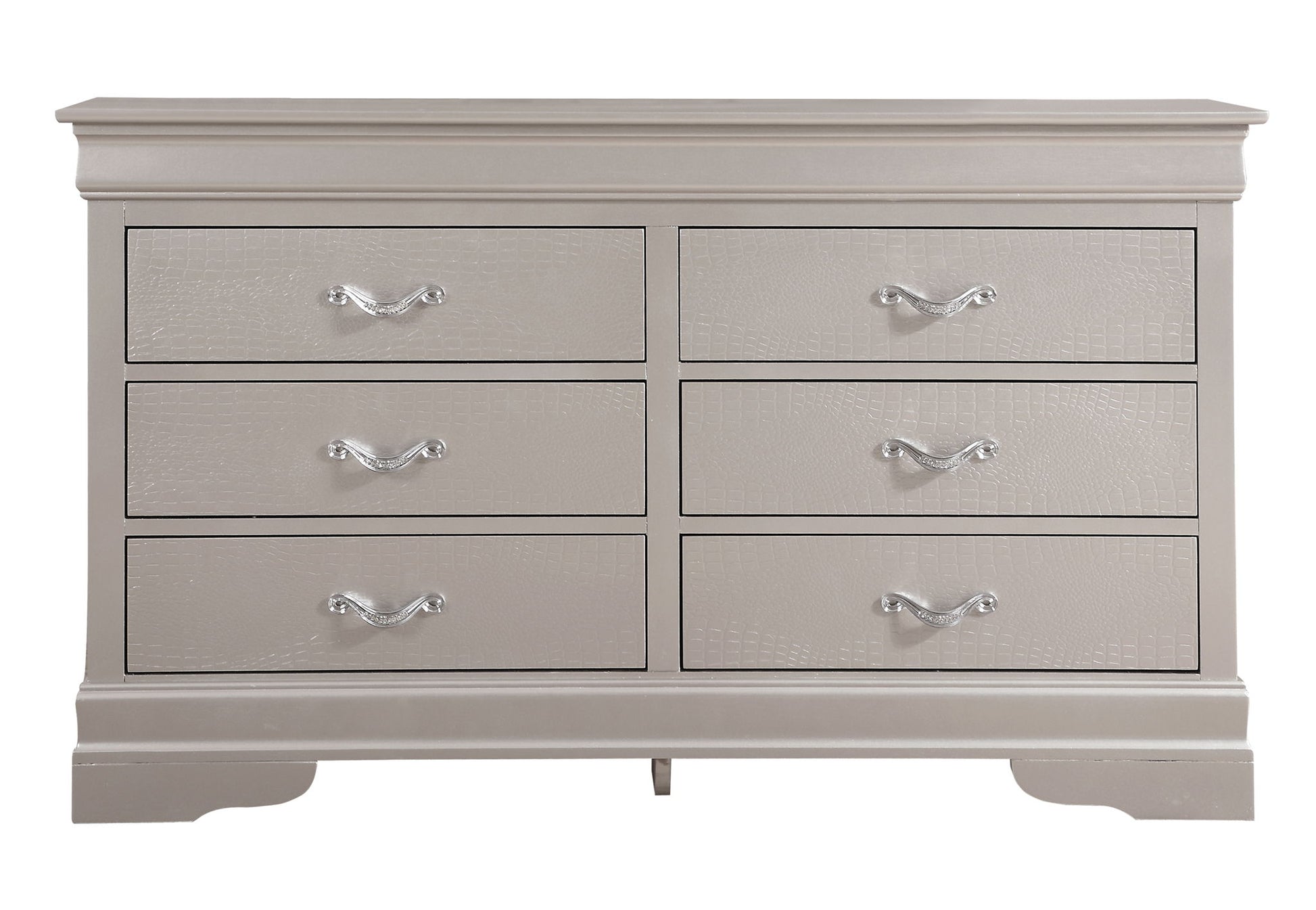 Introducing the Lorana dresser from Glory Furniture, featuring a captivating croc finish that enhances its visual appeal. This dresser is crafted with wood veneers, showcasing a striking color that fits seamlessly into various bedroom themes. With dimensions of 33 inches high, 59 inches wide, and 16 inches deep, it provides generous storage capacity while maintaining a sleek profile. The design elements create a balanced look, combining functionality and aesthetic appeal for any room.