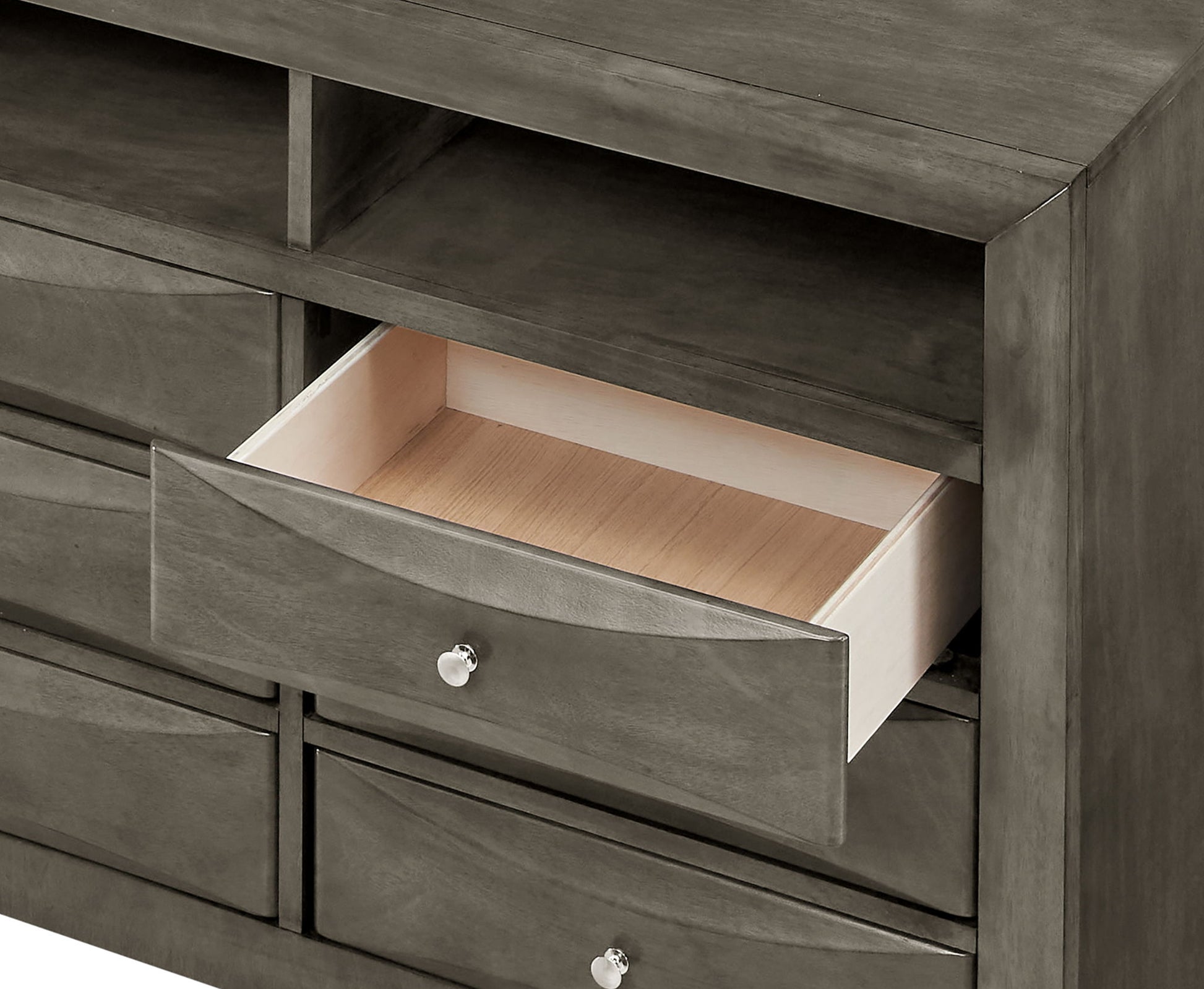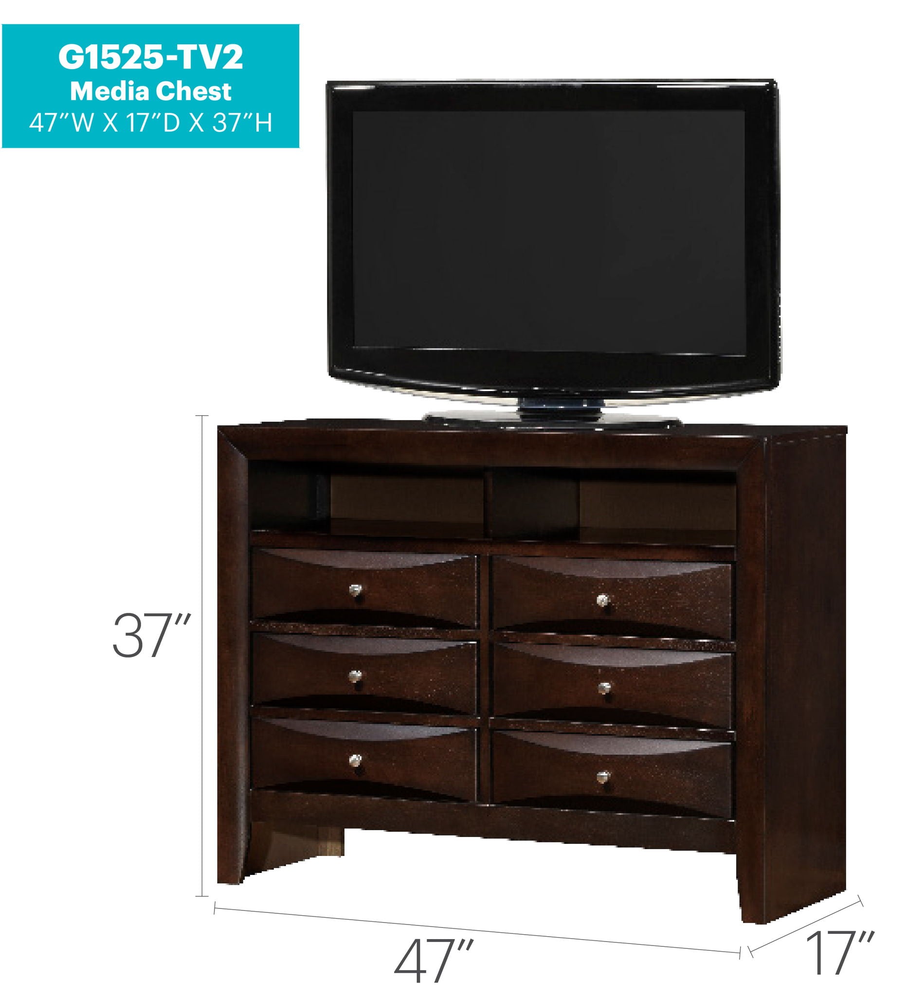 This chest is ideal for tighter spaces, maximizing storage without sacrificing floor area. Nickel hardware enhances the aesthetic while ensuring dependable operation. The sleek beveled drawer fronts promote a refined look and enhance user experience, making organization simple and efficient. Each spacious drawer, with dimensions of 17 inches wide, 13 inches deep, and 4 inches high, provides ample space for storing a variety of items, keeping your entertainment area tidy and well-ordered.