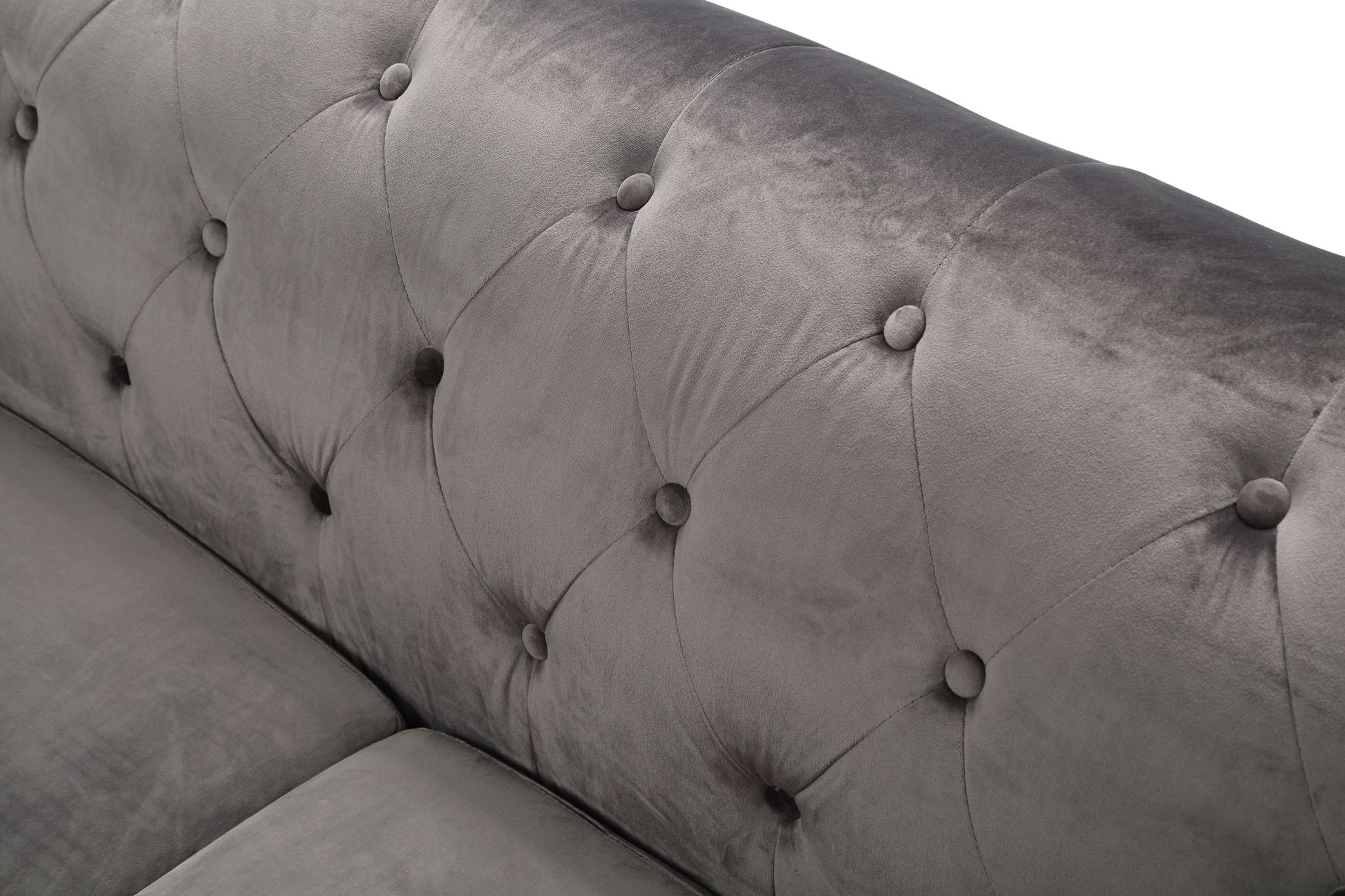 Additional design elements include beautiful button tufting on the arms and back, which adds a refined and sophisticated detail that enhances the overall aesthetic appeal. This sofa not only provides comfort but also becomes an eye-catching centerpiece in your living area.