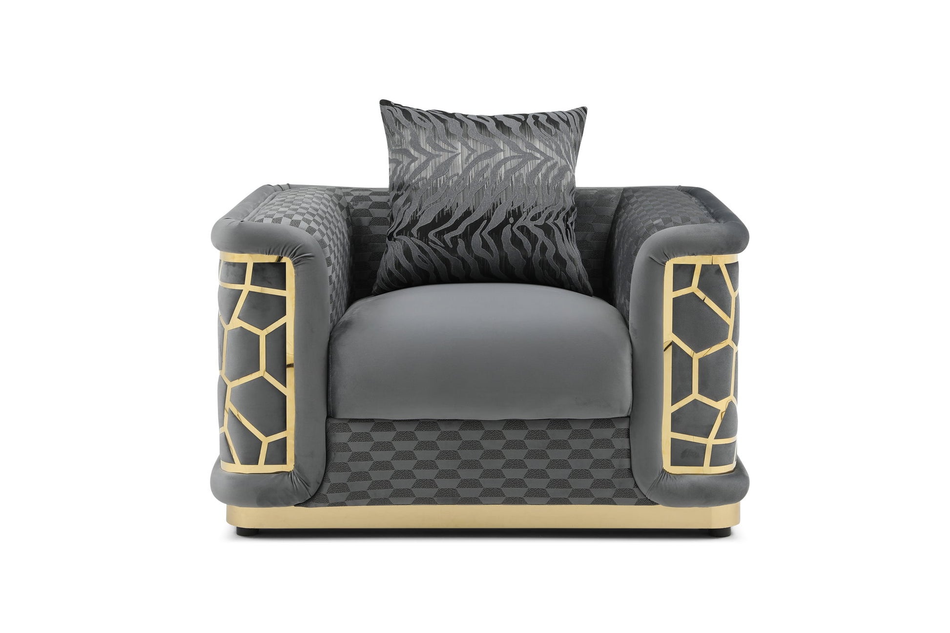 With a soft padded micro suede cover, this chair offers a cozy seating experience, while remaining durable and easy to maintain, ensuring it looks and feels wonderful for years. Gloss brass trim accents along the sides lend a touch of refinement, further complemented by the unique patterned fabric on the inside arms and back, creating an inviting and stylish presentation.