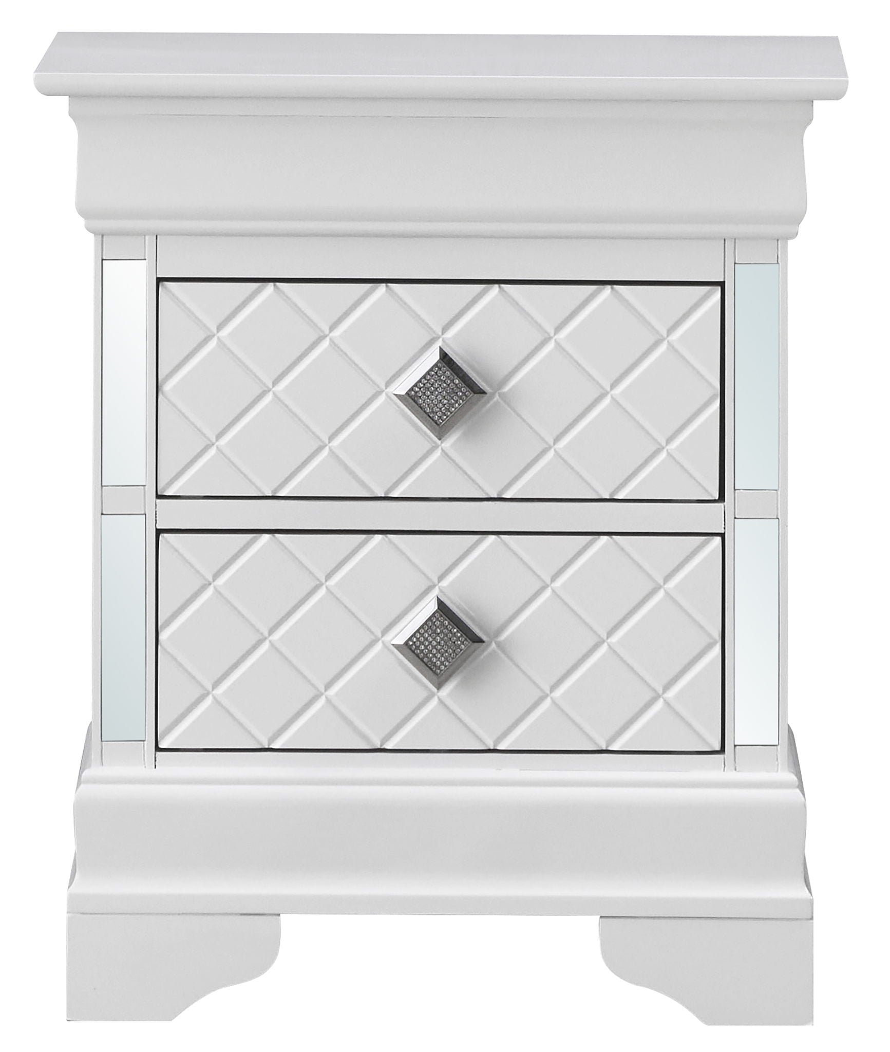 Discover the combination of functionality and aesthetics with this nightstand. Dressed in a stunning Metallic finish, it brings a contemporary flair to your bedroom while offering essential storage solutions. The eye-catching chrome pulls, embellished with faux crystals, not only enhance the visual appeal but also provide ease of access to the drawers.