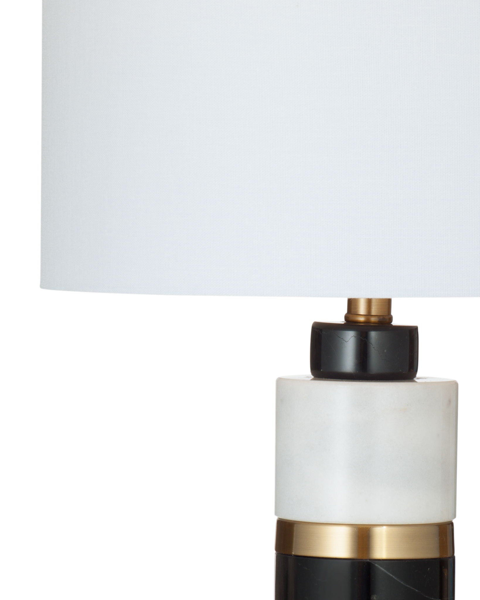 The Gregory Table Lamp features a sleek two-tone black and white marble base with gold accents, offering a sophisticated contrast that complements a variety of modern interiors. The white drum shade softens the light, creating a warm, inviting glow. Its contemporary design adds a touch of elegance to any space, making it a versatile and stylish choice for living rooms, bedrooms, or offices. The Gregory Table Lamp combines refined materials and clean lines to enhance your decor with both form and function.