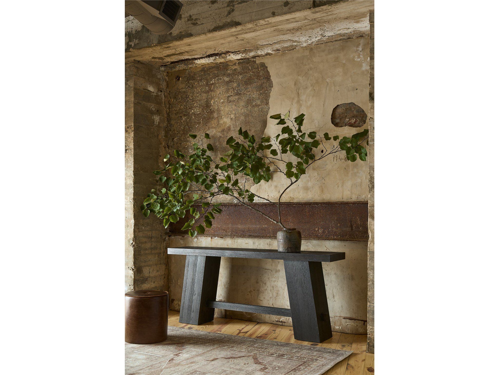 The Obsidian Console Table is a sturdy and stylish piece of furniture that adds a touch of natural warmth to any space. Its angled legs and horizontal design element, echoing the lines of the tabletop, create a visually interesting look, making it a functional and stylish addition to any entryway or living room.