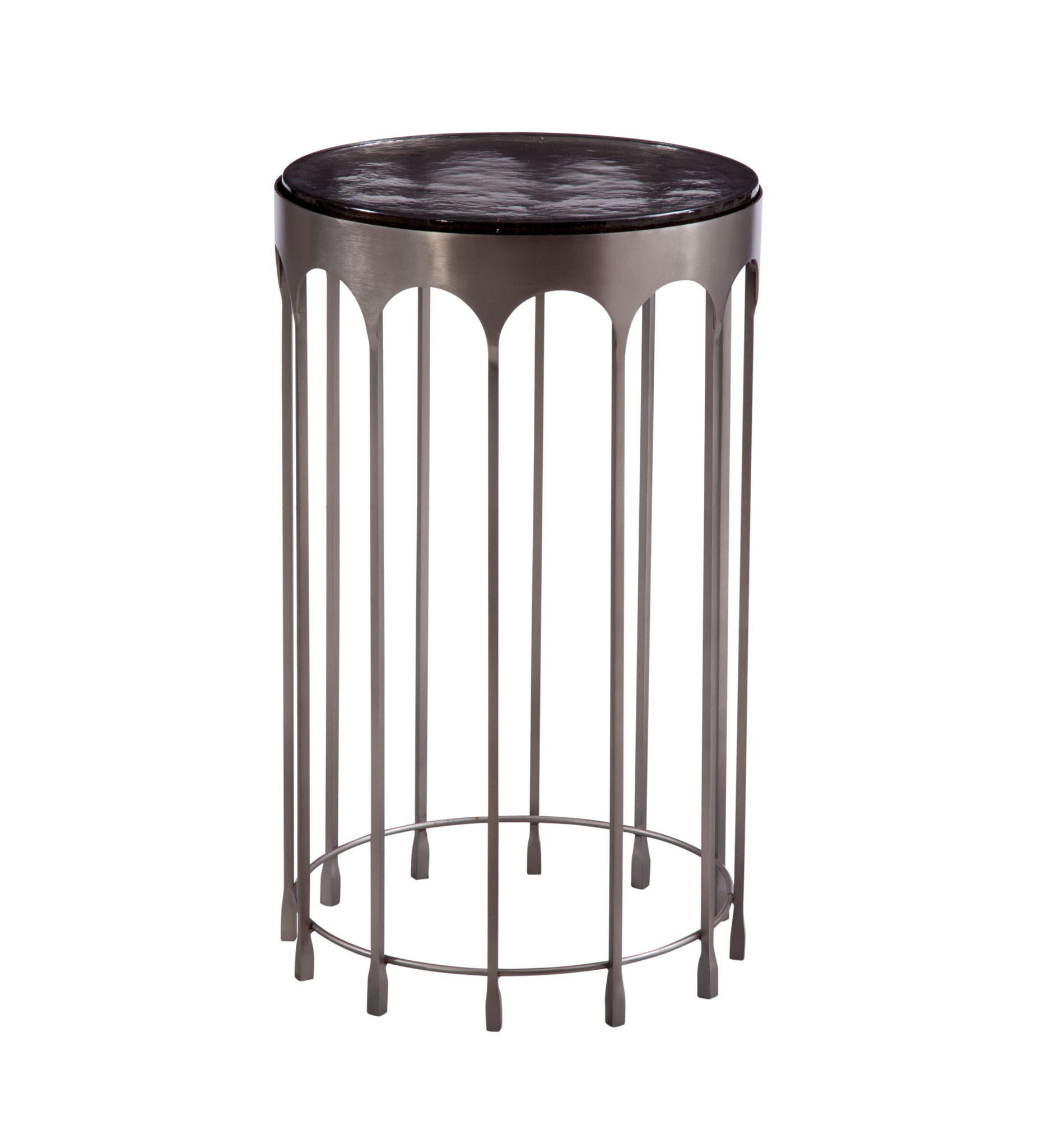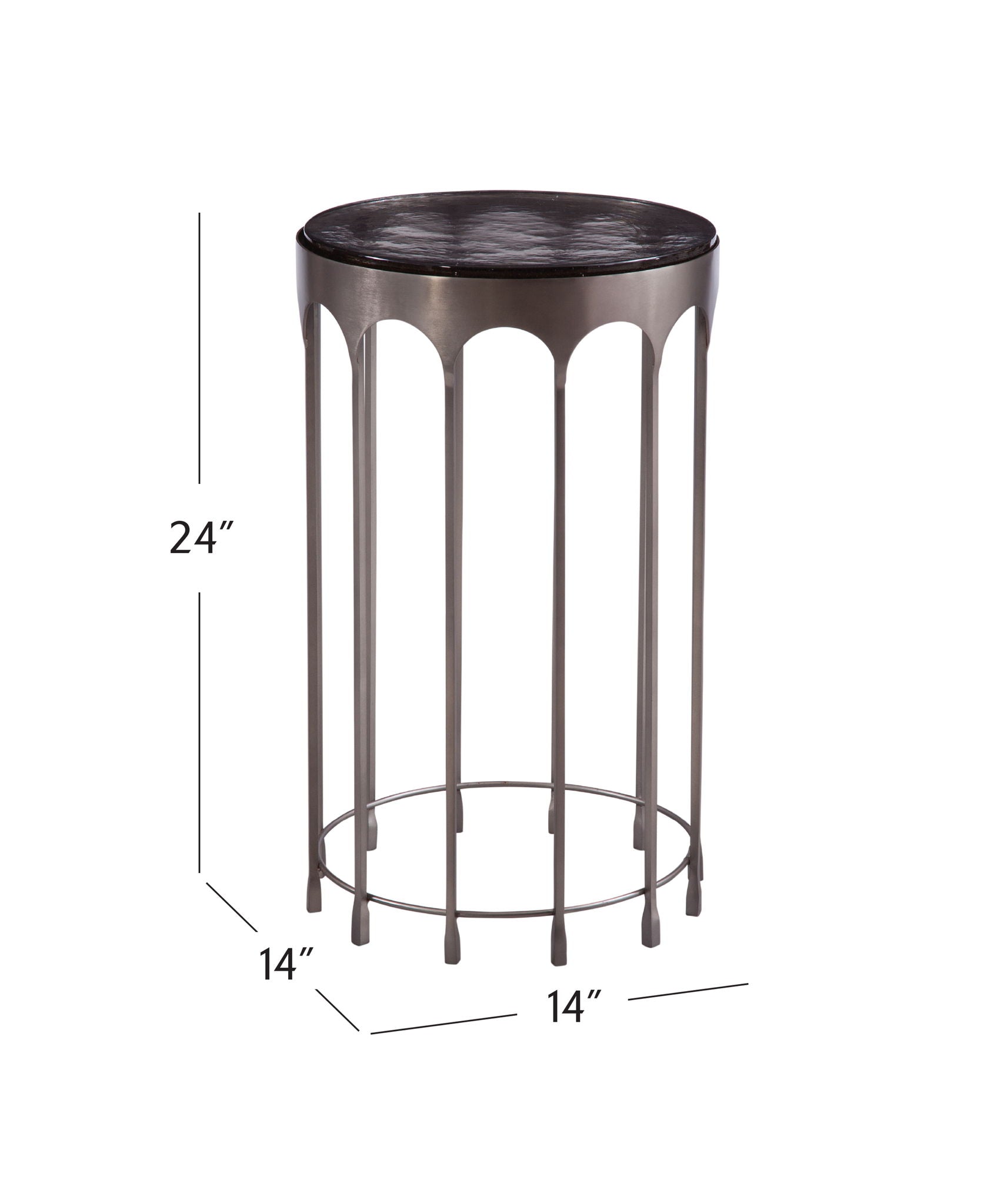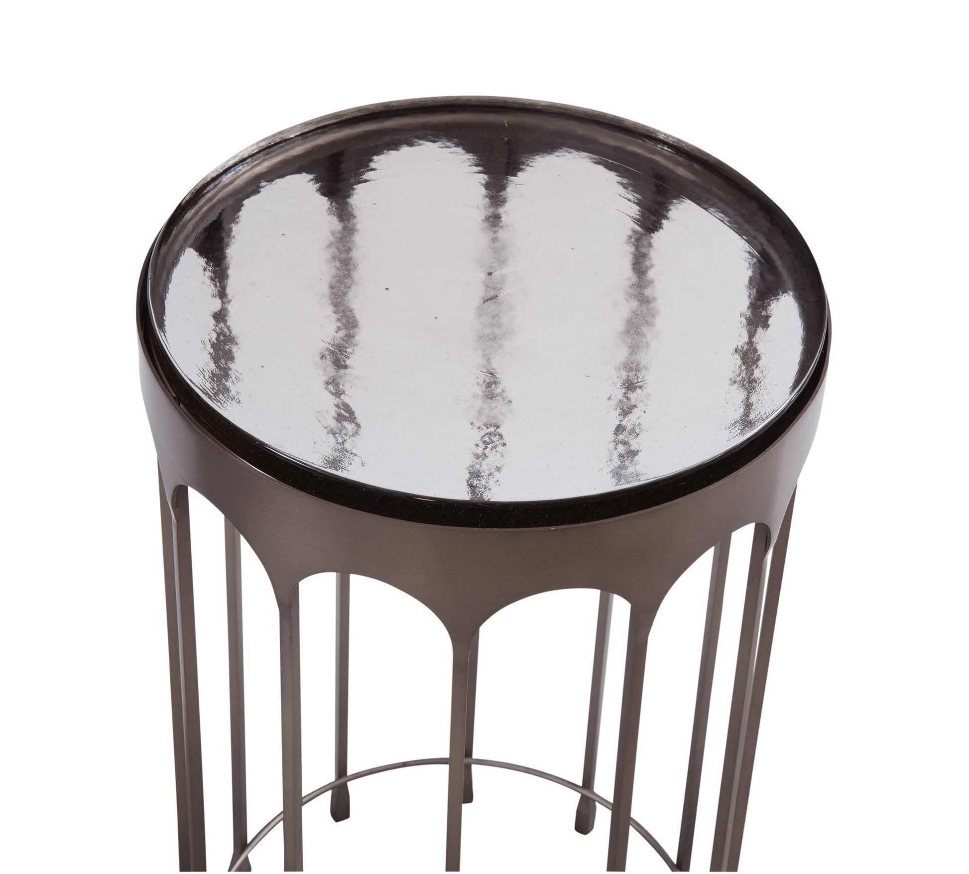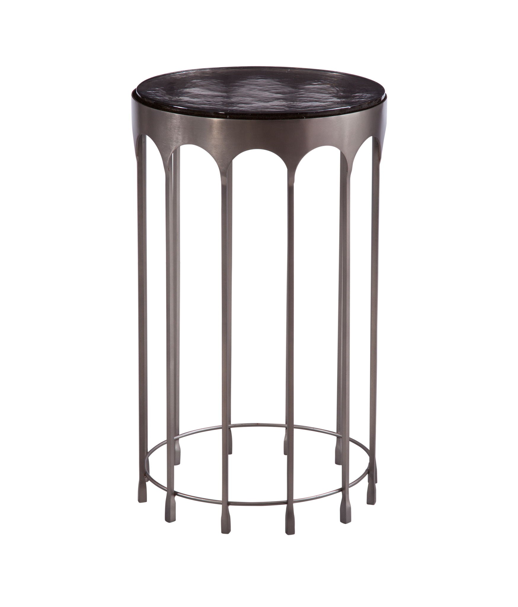 Introducing the Hartley Accent Table in sophisticated black contemporary style. Crafted with a thick, round cast glass top and a sleek nickel-finished iron base featuring an elegant arched design motif, this table adds a touch of modern elegance to any space. Its quality construction and unique design make it a chic and stylish addition to your home decor. With no assembly required, it offers effortless placement and enhances your interior with ease.