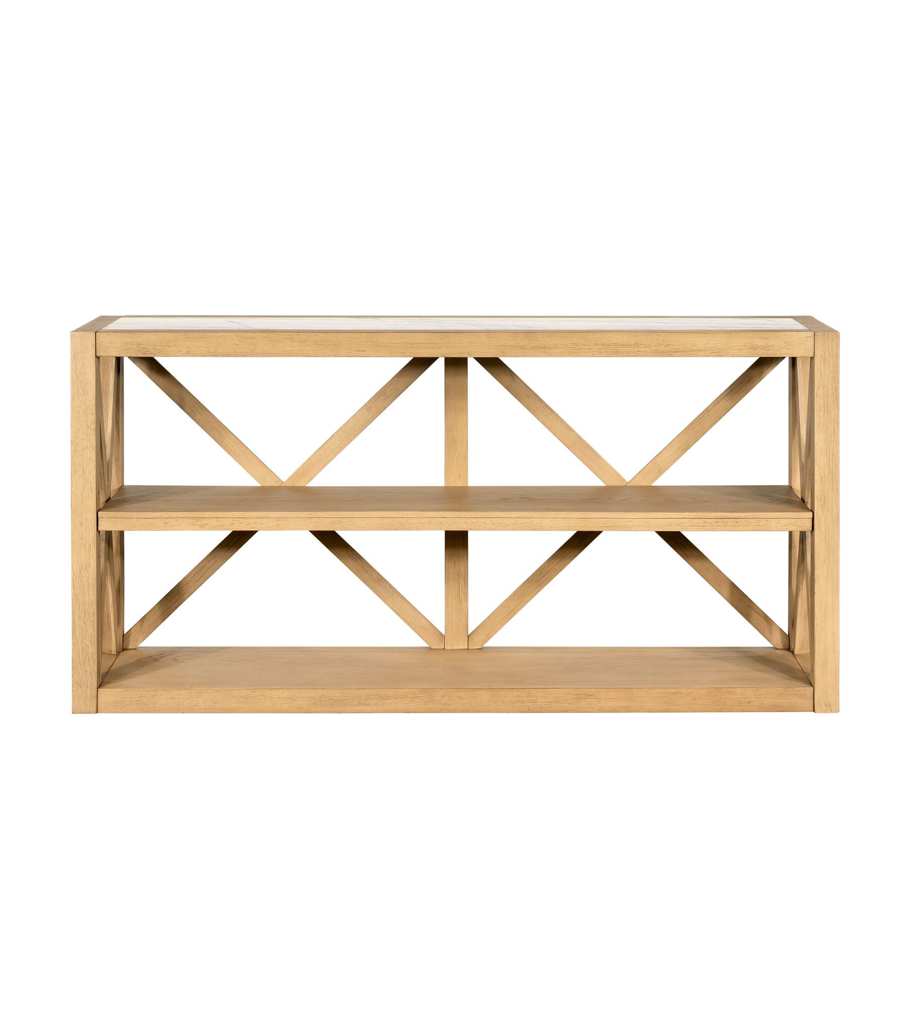 The Holden Console Table combines timeless design with a touch of modern sophistication. Crafted from solid wood and oak veneers in a sunlit oak finish, this piece radiates warmth and elegance, effortlessly blending traditional elements with contemporary flair. An inset white Carrara marble veneer top elevates the console’s luxurious appeal, making it a striking addition to any room. The airy open design, accentuated by the distinctive X-shaped end panels, offers a unique visual element that draws the eye. With its refined look and functional form, this console table is perfect for adding a stylish touch while maintaining practicality in your space.