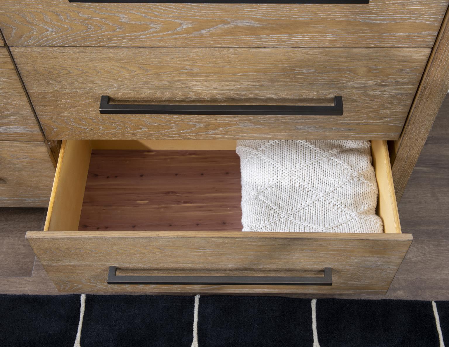 Casual style meets understated elegance with the 5039 Horizons bedroom collection. Dressed in a beautifully textured Weathered Oak finish,, this collection brings a sense of calm,, warmth,, and effortless charm to your space. Crafted from Select Hardwood Solids and Oak veneer,, each piece is designed with durability and simplicity in mind. The clean lines offer a relaxed,, modern feel,, while Antique Bronze Hardware adds a touch of vintage character for just the right amount of depth and detail. Built to function as beautifully as it looks,, drawers feature French dovetail construction and smooth ball bearing side glides for a seamless everyday experience. The collection centers around the inviting Panel Bed,, designed with a low profile footboard that keeps the look open,, light,, and livable. Available in twin,, full,, queen,, and king,, it's a fit for every space - from cozy guest rooms to your main retreat.