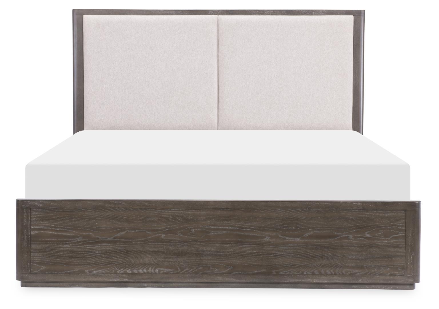 Clean lines,, cozy textures,, and a timeless finish create a space that feels like home with the Horizons bedroom. Wrapped in a rich finish,, this casually elegant collection blends warmth and depth with a modern ease. Oak veneers and select hardwood solids bring natural character,, while the Carbon Gray Hardware adds a sleek,, contemporary contrast. Each piece is designed with gracefully curved edges and soft corners,, creating a sense of flow and serenity. Thoughtful craftsmanship shines with the French dovetail drawer construction and smooth ball bearing side glides that make every interaction effortless. At the heart of the collection is the Panel Bed,, featuring an Upholstered Headboard in a soft taupe fabric- a plush,, inviting detail that adds comfort and quiet luxury. Available in twin,, full,, queen,, and king,, this bed is made to suit every space.