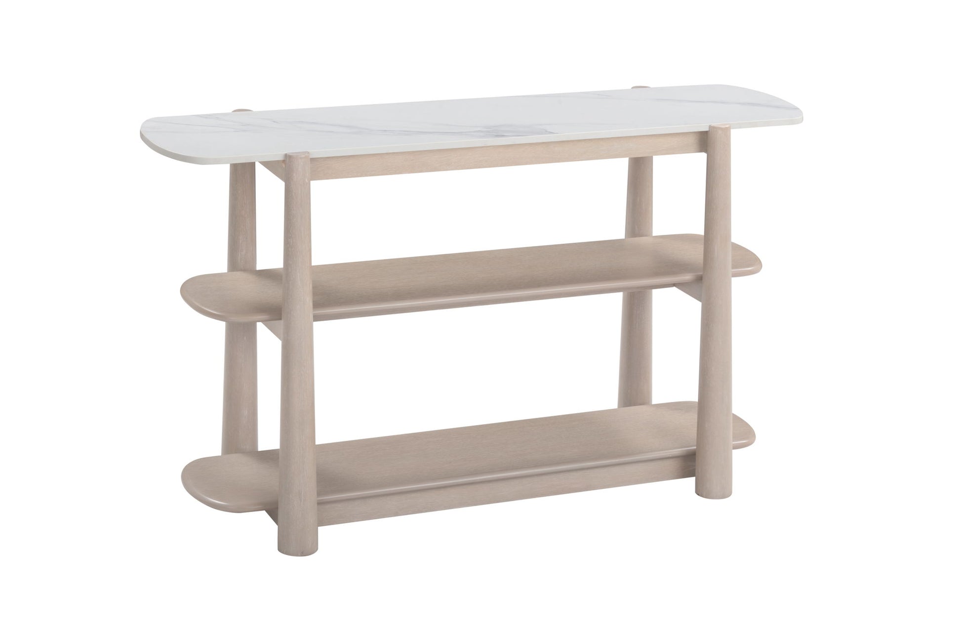 The Horizons console table embodies modern coastal charm with its sleek design and natural elements. Featuring a rounded corner white marble top, this table exudes elegance and sophistication. The frame, crafted from solid wood and veneers, showcases a serene white oak finish, complemented by round tapered legs that add a touch of refinement. With two additional shelves, it offers practical storage solutions without compromising on style. Each piece of marble used is entirely unique, with variations in color, density, grain, and finishing, ensuring a one-of-a-kind addition to your home decor. Embrace the essence of California coastal living with the Horizons console table, a perfect blend of modern aesthetics and natural beauty.
