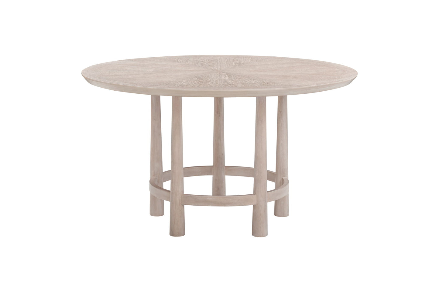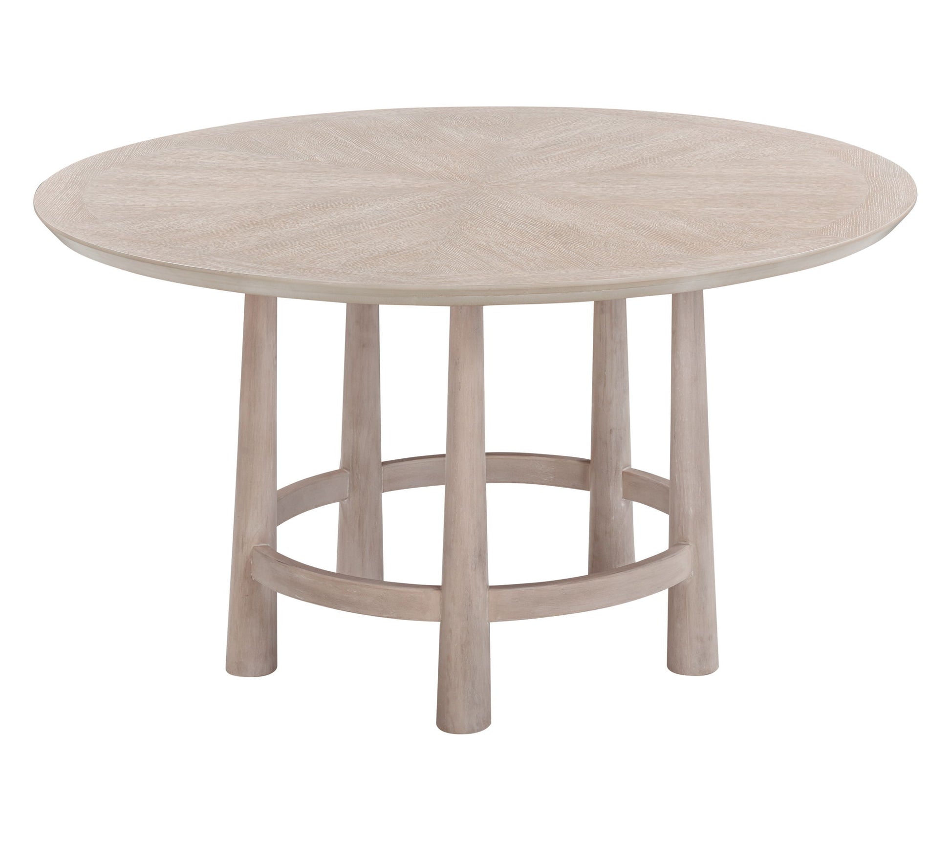The Horizons Dining Table blends modern design with coastal aesthetics, offering a perfect fusion of style and functionality. Crafted from wood and white oak veneers, it features a cerused white oak finish with a subtle white glaze, adding a touch of sophistication to any dining space. The 54" round top showcases a beautiful starburst veneer pattern, while the straight grain oak veneers, round tapered legs, and round stretcher in the base contribute to its elegant yet sturdy construction.