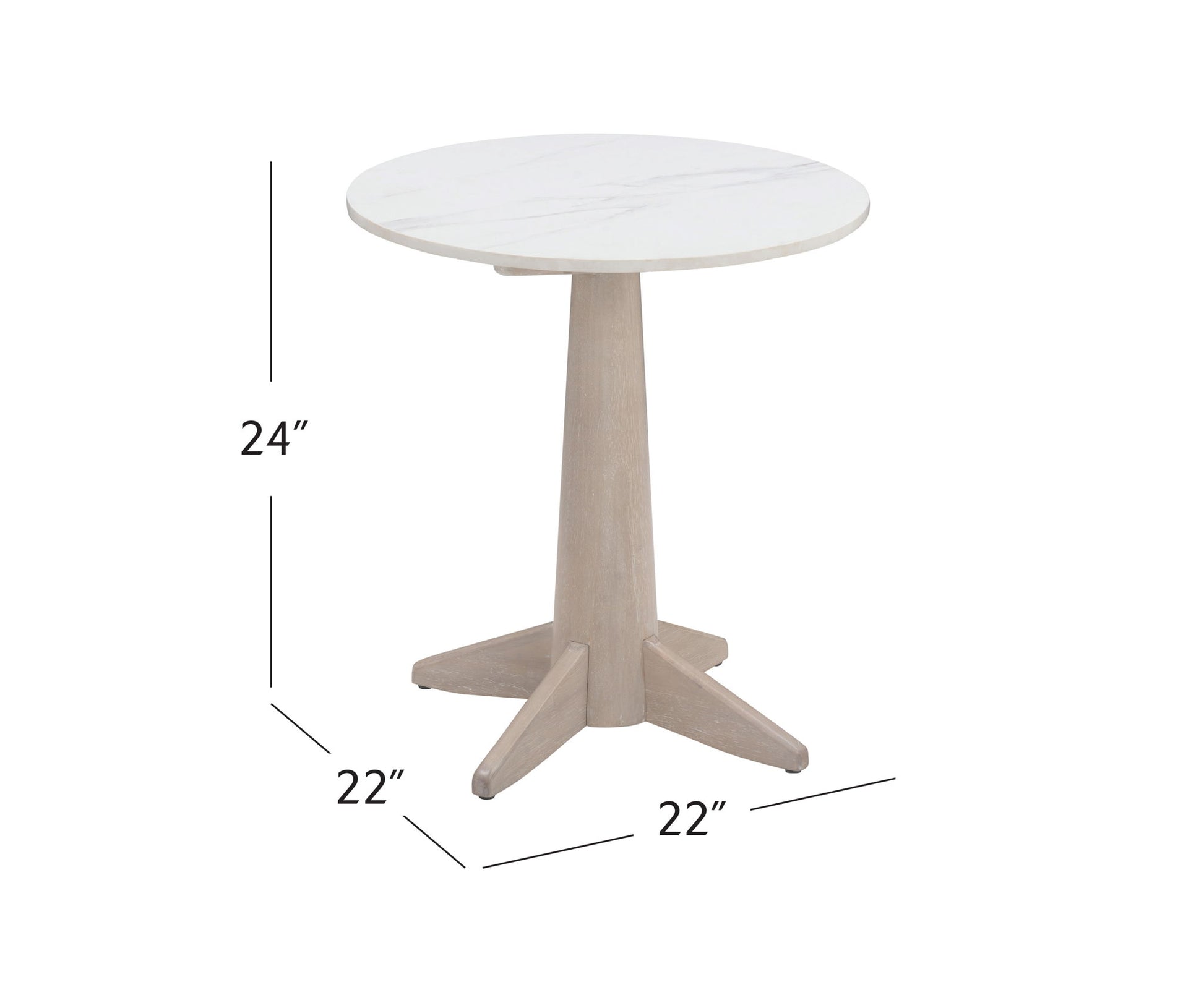 The Horizons end table epitomizes modern coastal elegance, blending natural materials seamlessly. Its round single-pedestal style features a pristine white marble top, exuding timeless sophistication. Crafted with a solid wood base in a neutral white oak finish, it strikes the perfect balance between functionality and style. As marble is a product of nature, each piece boasts unique variations in color, density, grain, and finishing, adding to its allure. With its modern design and coastal charm, the Horizons end table is a captivating addition to any living space, bringing a touch of California coastal ambiance to your home.