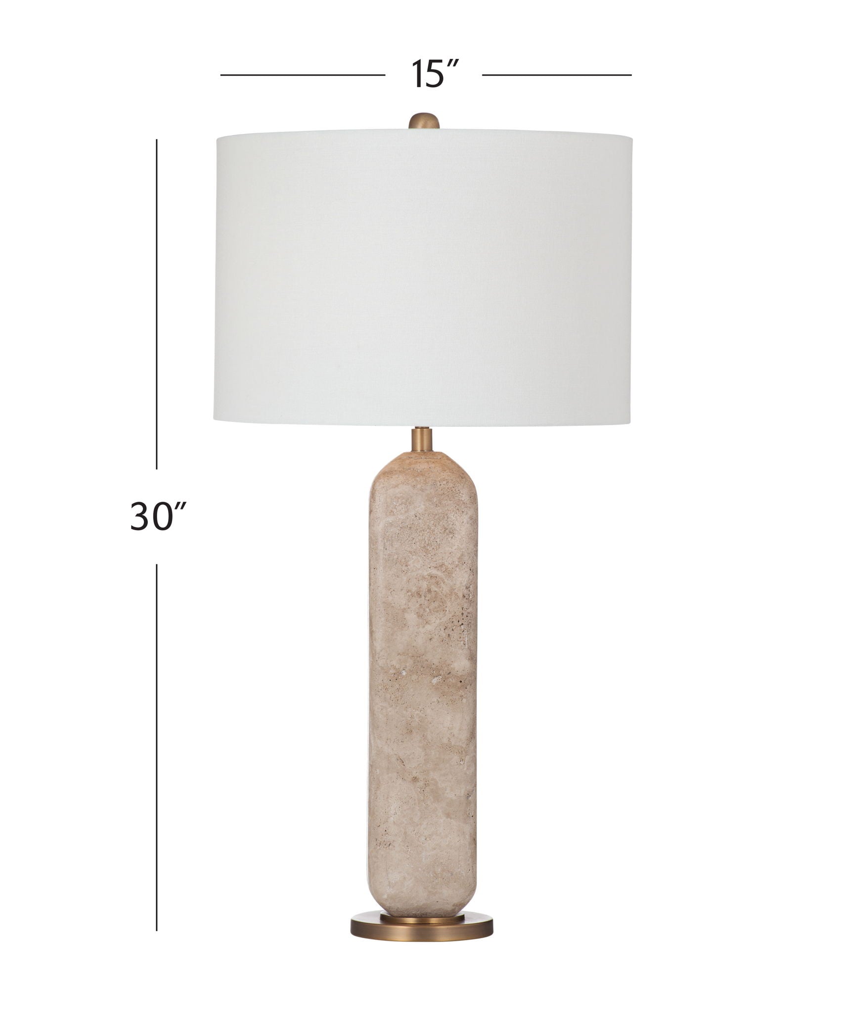 The Humboldt Table Lamp is skillfully crafted from travertine, accompanied by a white linen drum shade and adorned with brass elements. This lamp exemplifies a sophisticated design, seamlessly blending classic aesthetics with modern allure. Meticulously crafted with attention to detail, the Humboldt Table Lamp stands as a refined addition to interior spaces. The travertine and brass elements complement the lamp's body, creating a visually appealing contrast. With its stylish design and meticulous craftsmanship, the Humboldt Table Lamp not only adds a modern edge to any room but also provides a soft and inviting illumination, making it a versatile and impactful contribution to interior decor.