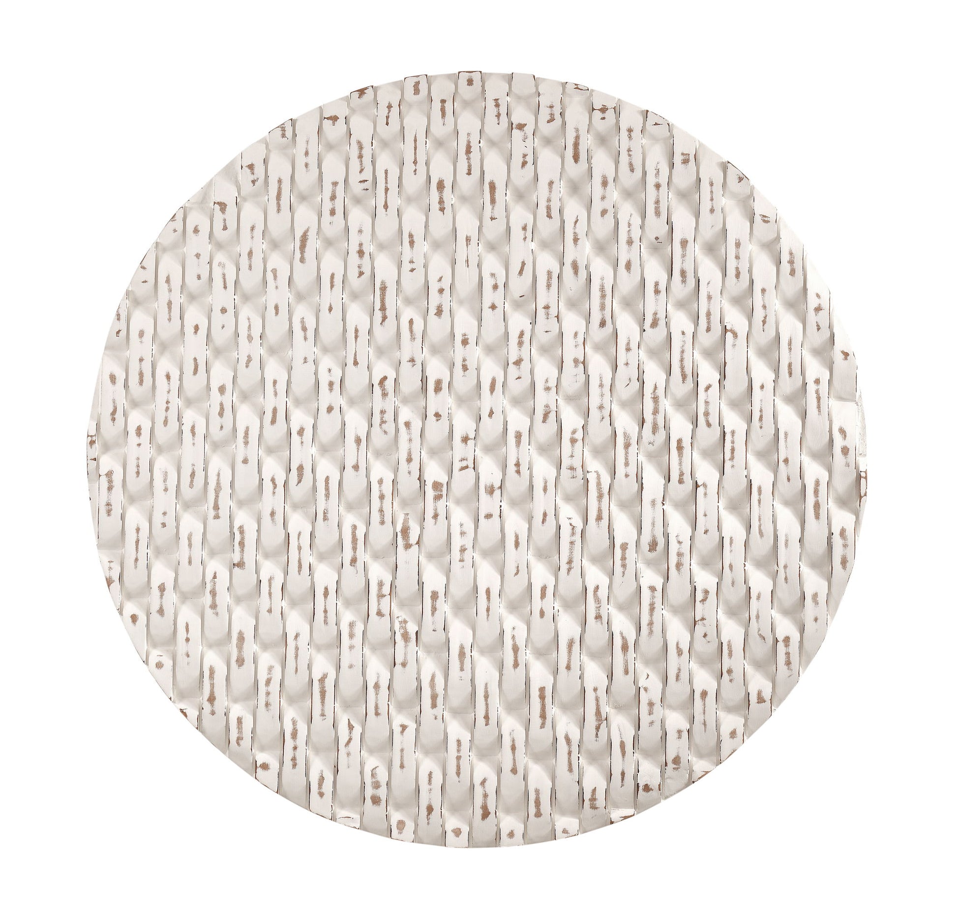 - Round carved wood with woven basket-inspired pattern