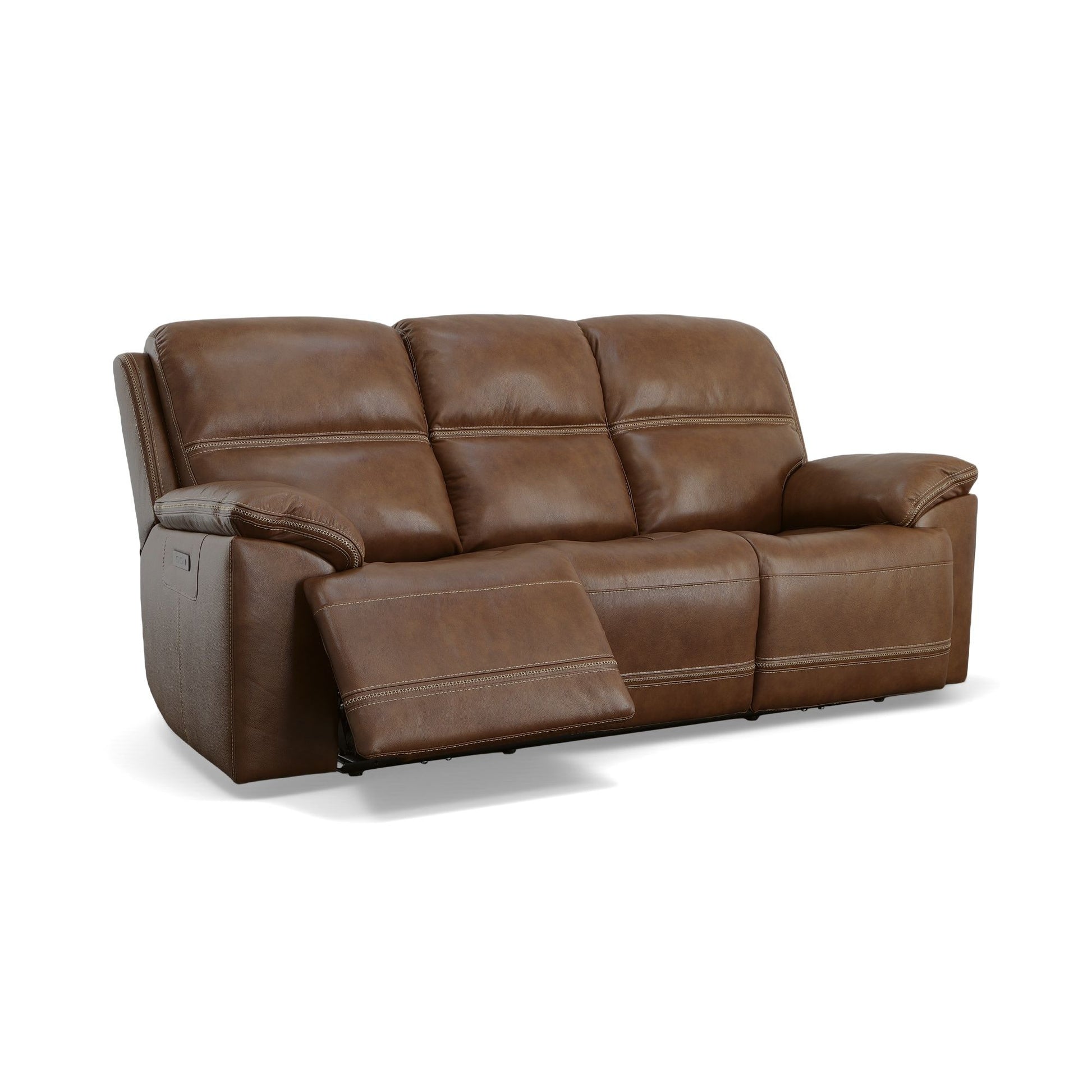 Inviting comfort and long-lasting support will make you want to stay nestled all day and night in the Jackson leather power reclining sofa. This sofa offers fine-tunable relaxation on the two outside seats with a dual power recline mechanism, adjustable headrests and Zero Gravity technology that reduces tension and pressure on the body. An attractive cross-stitch pattern on the back, armrest edges and footrests add distinctive style, while the waterfall chaise footrests and pillowy arms provide comfortable support. Built-in USB ports keep mobile devices conveniently charged and ready for streaming. With Flexsteel's patented Blue Steel Spring™ at the heart of each seat, and high-quality, dark brown leather, the Jackson power reclining sofa brings durability and a touch of rugged style to your home.