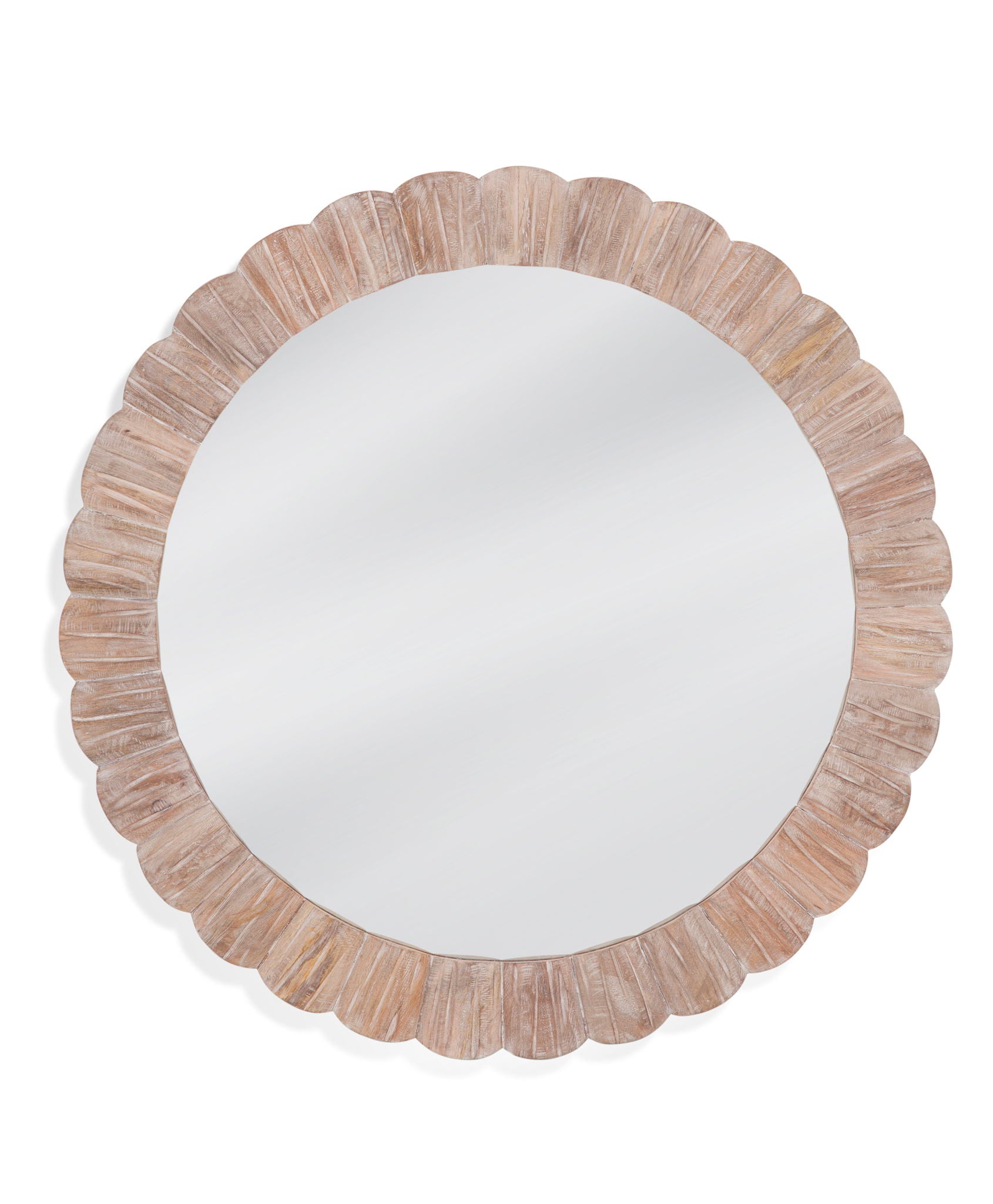 Jacque Wall Mirror is round with soft scalloped edges finished in a natural mango wood with highs and lows of the natural mango wood color patterns.