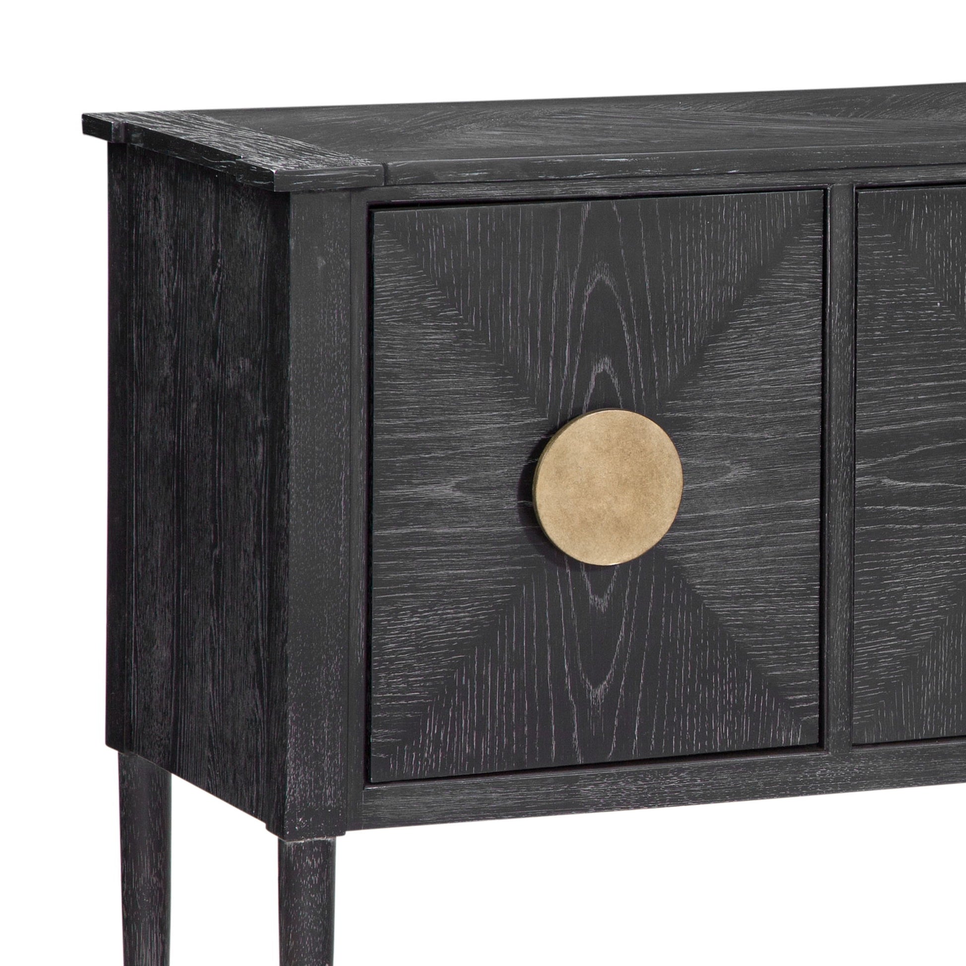 The Jensen Console table brings a modern glam style to the home. Constructed with rubberwood solids and flat-cut, cerused oak finished in a black stain. The open grain finish features generous white wax hang-up. The dark wood is accented with hand-padded gold leaf finished panels and hardware, which tie back to the bronze finished foot caps on each piece. This server features three doors with a single adjustable shelf behind each providing ample storage.