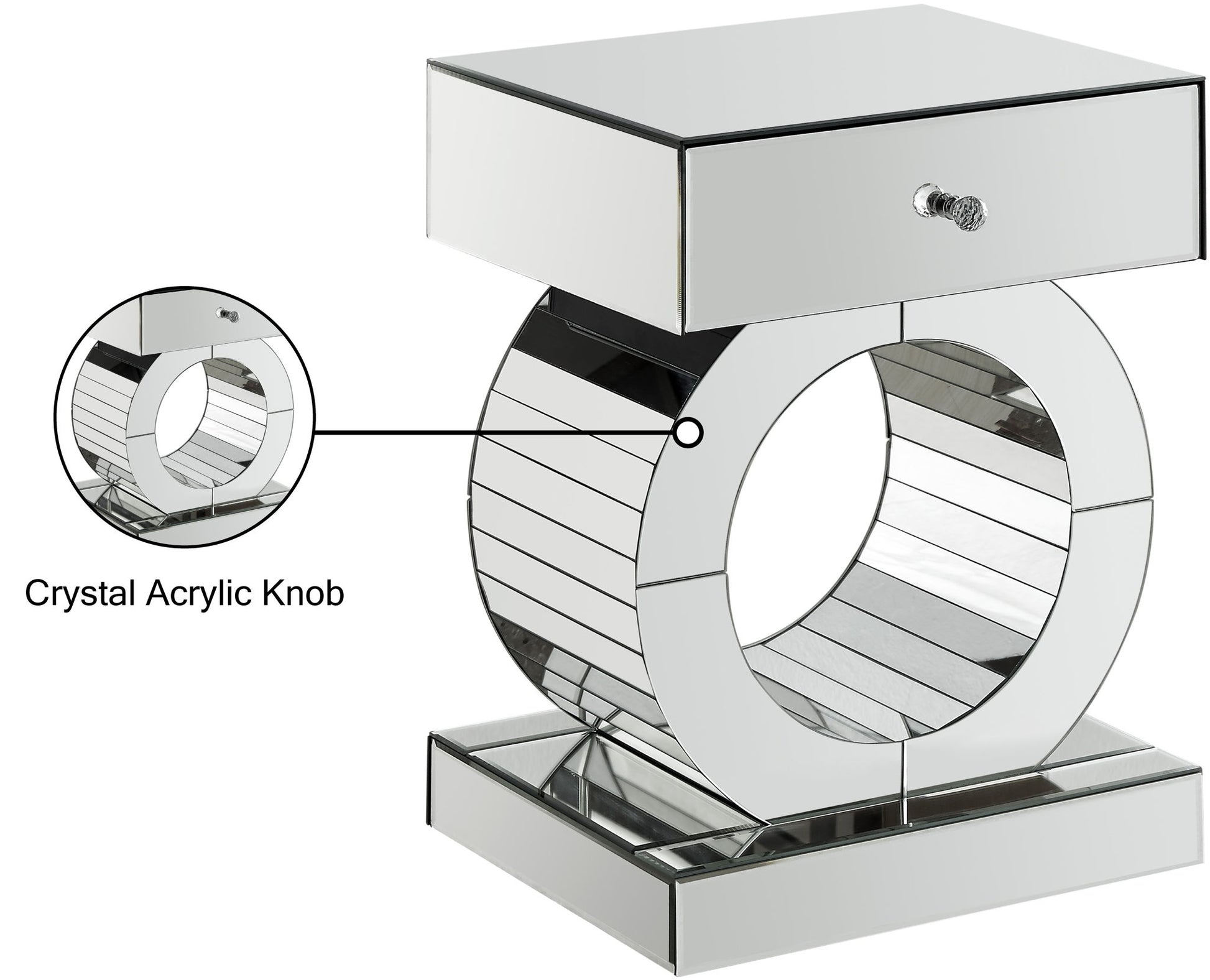 Make this Joceyln end table the center of attention in your living room. This handsome table features a bold design with a geometric footprint that's sleek, chic, and modern. The surface areas of the table are covered in mirrored accents and crystal acrylics, adding depth and dimension to your room while upping the piece's wow factor. The large surface area gives you room for displaying books or other collectibles. Pair it with other items in the Jocelyn collection for a coordinated, modish finish.