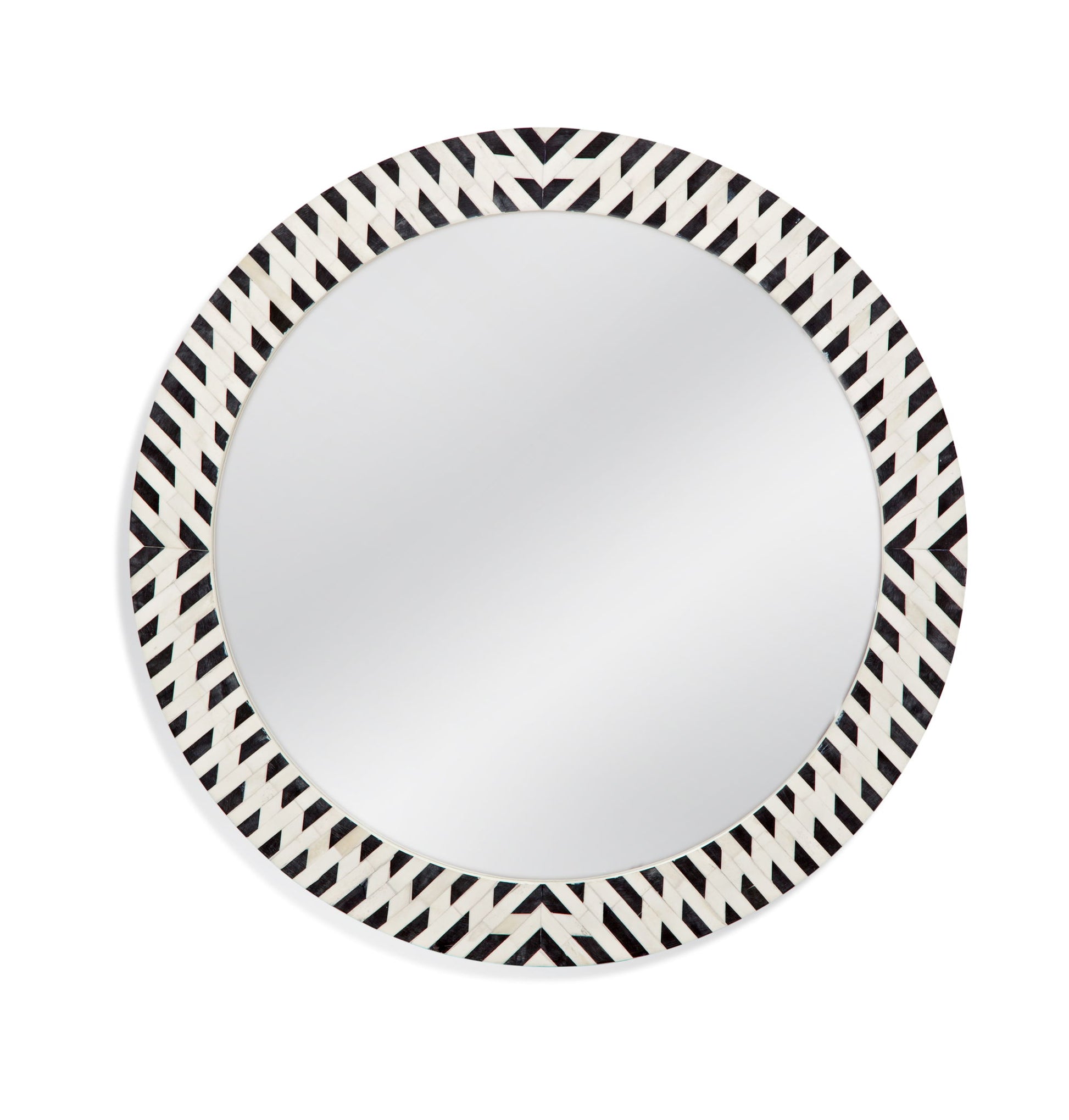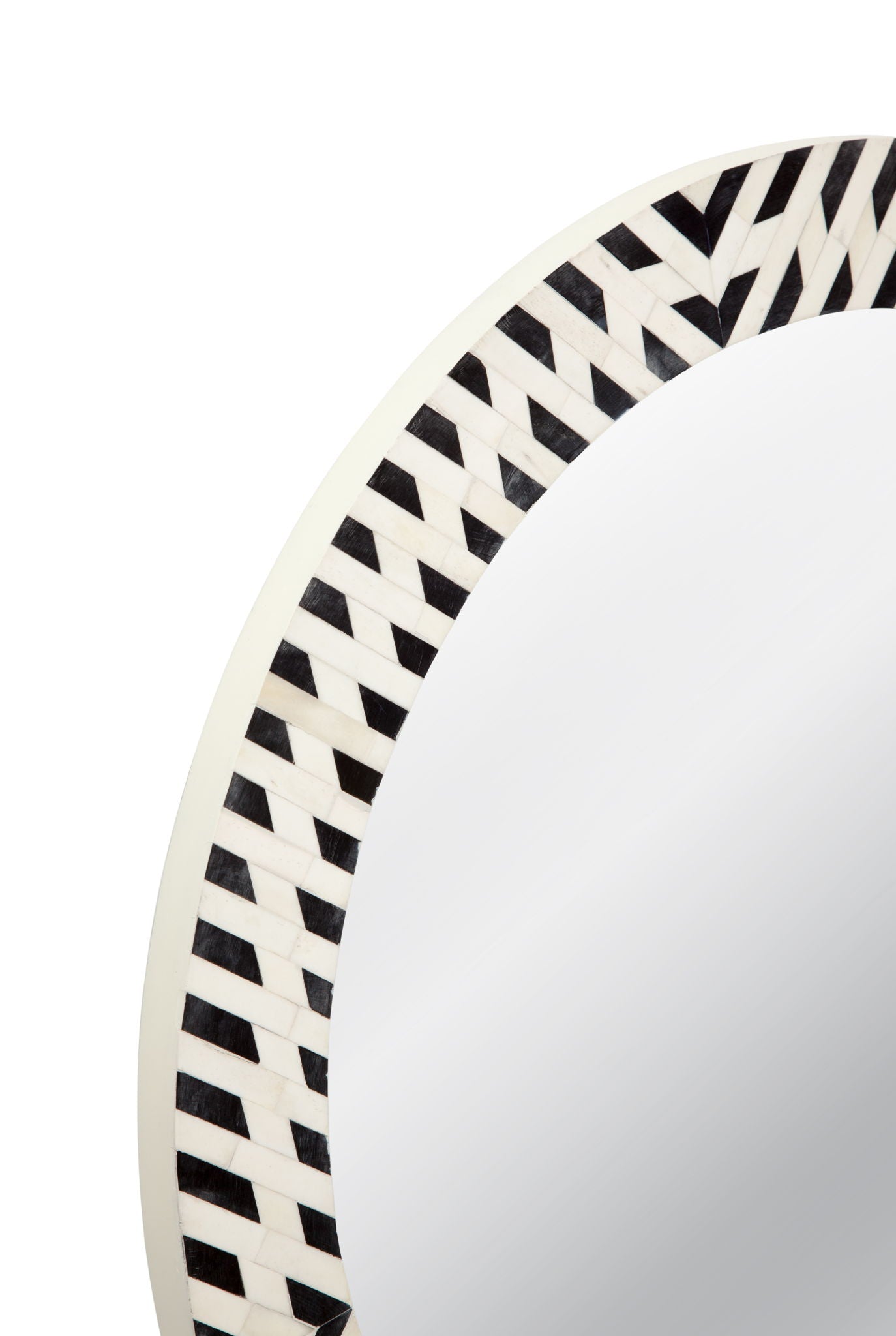 Joey Wall Mirror is round framed in a black and white bone and resign frame. Includes two "D" ring attachment points for ease of access for hanging.
