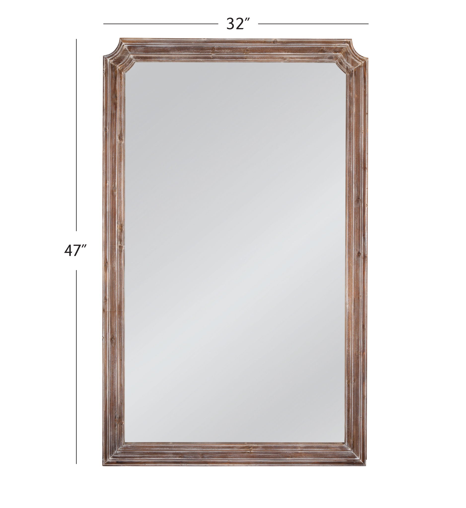The Joss Floor Mirror, crafted from wood, boasts a charming weathered wood finish that exudes rustic farmhouse charm. Its rectangular shape, complemented by curved corner detailing, adds character and warmth to any room, blending seamlessly with traditional and farmhouse-inspired decor styles.