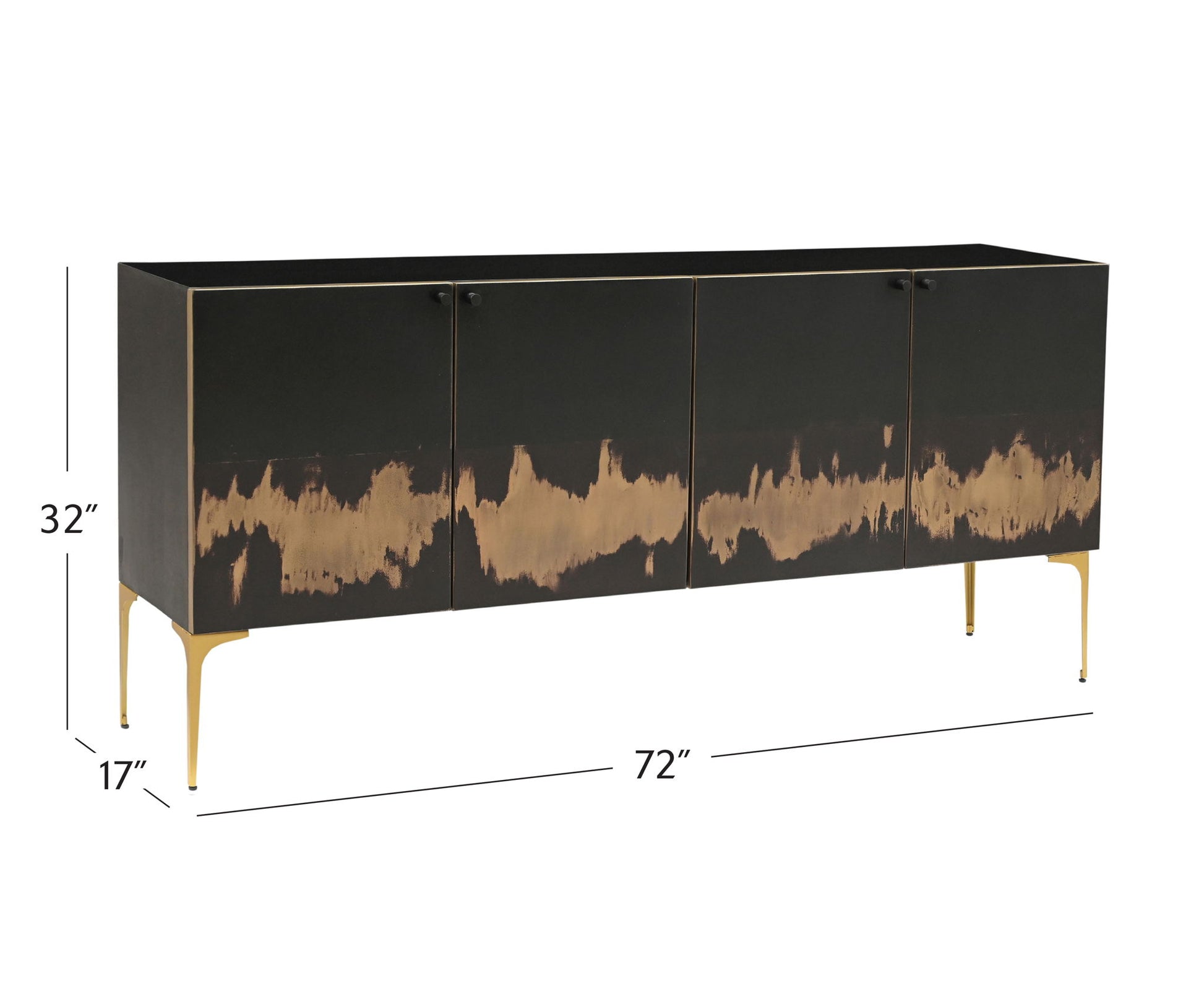 The Kali Iron Sideboard, where modern luxe meets timeless craftsmanship. Crafted from solid iron, each of its four doors undergoes a unique acid-wash process, resulting in a one-of-a-kind piece. Inside, discover functionality with four shelves and media cord management. Resting on slim tapered legs finished in brushed gold, Kali adds character and sophistication to any space.