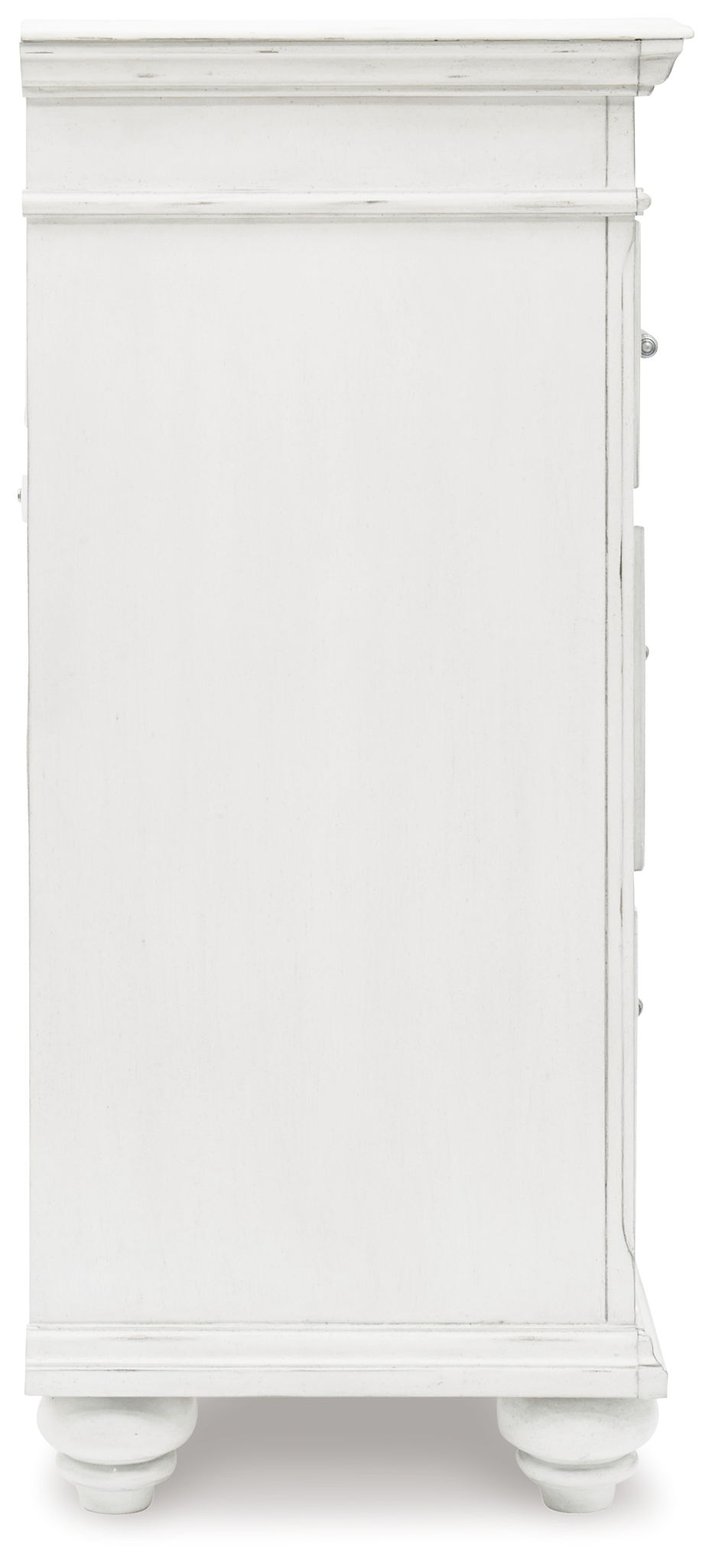 Made with veneers and select hardwood solids in a distressed whitewashed finish. Design features updated traditional styling with generously scaled moulding details. Dresser features 7 full sized drawers with 2 small scaled accessory drawers. Ball bearing side glides. Hardware has a transitional aesthetic and is finished in a dark gray pewter color. Mansion style headboard options feature a picture framed panel or inset tufted taupe upholstery cushion. Optional storage bench footboard.