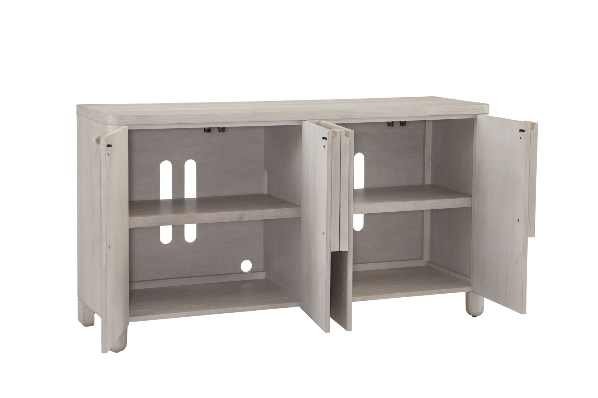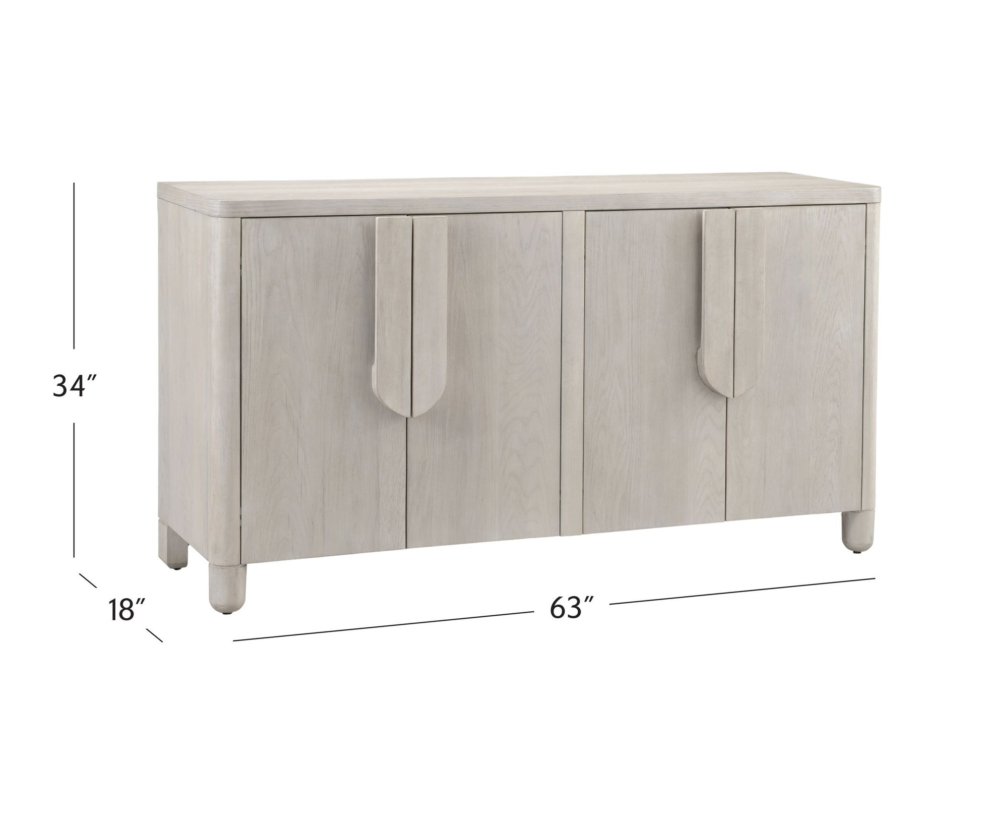 The Karina Server effortlessly combines refined glam with a modern and chic design, creating a piece that's as stylish as it is functional. Its minimalist design showcases a lovely washed blonde oak finish, complemented by soft curves that carry throughout the collection. Crafted from high-quality rubberwood solids and flat cut oak veneers, the Karina Server exudes both elegance and durability, making it a stunning addition to your home decor. With four doors opening to two cabinets, each featuring an adjustable shelf and convenient media cable storage, this server is not only a beautiful piece but also a practical addition to your living space.