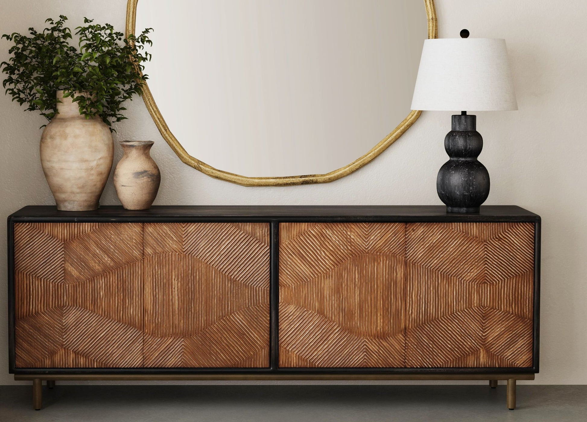 Introducing the Keir Server seamlessly blends modern aesthetics with a warm, moody color palette. Crafted from solid mango wood, its two-tone dark brown and ebonized finishes create captivating visual contrast. The dramatic iron base, finished in brushed brass, adds sophistication. Opening the doors reveals an organic-inspired geometric design, complemented by push-clasp hardware. Inside, discover functionality at its best with four adjustable shelves and thoughtful media cord management.