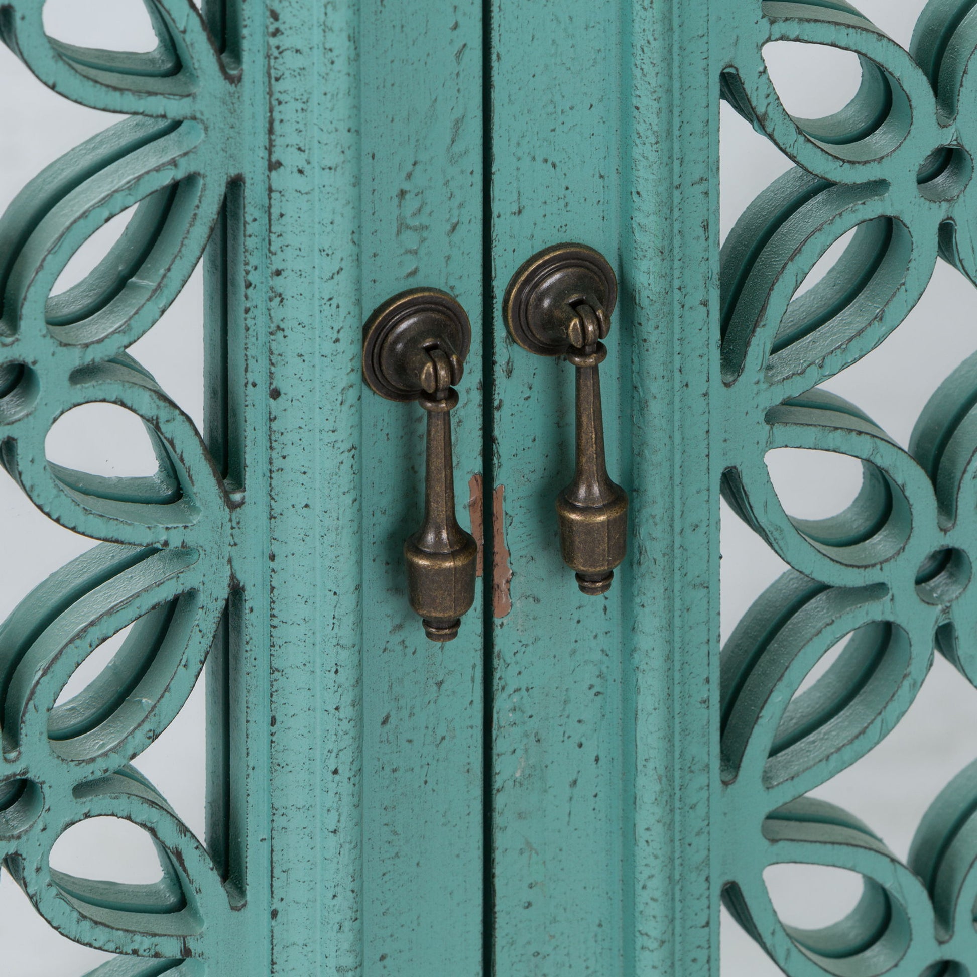 Transform your home with the Kensington accent cabinet. Crafted of Eucalyptus solids and Ash veneers in a wire brushed Turquoise finish and Spice wood tone top. Features mirrored doors with decorative floral pattern overlays, block feet and one concealed fixed shelf behind doors. A unique piece that will work with any décor from traditional to contemporary.