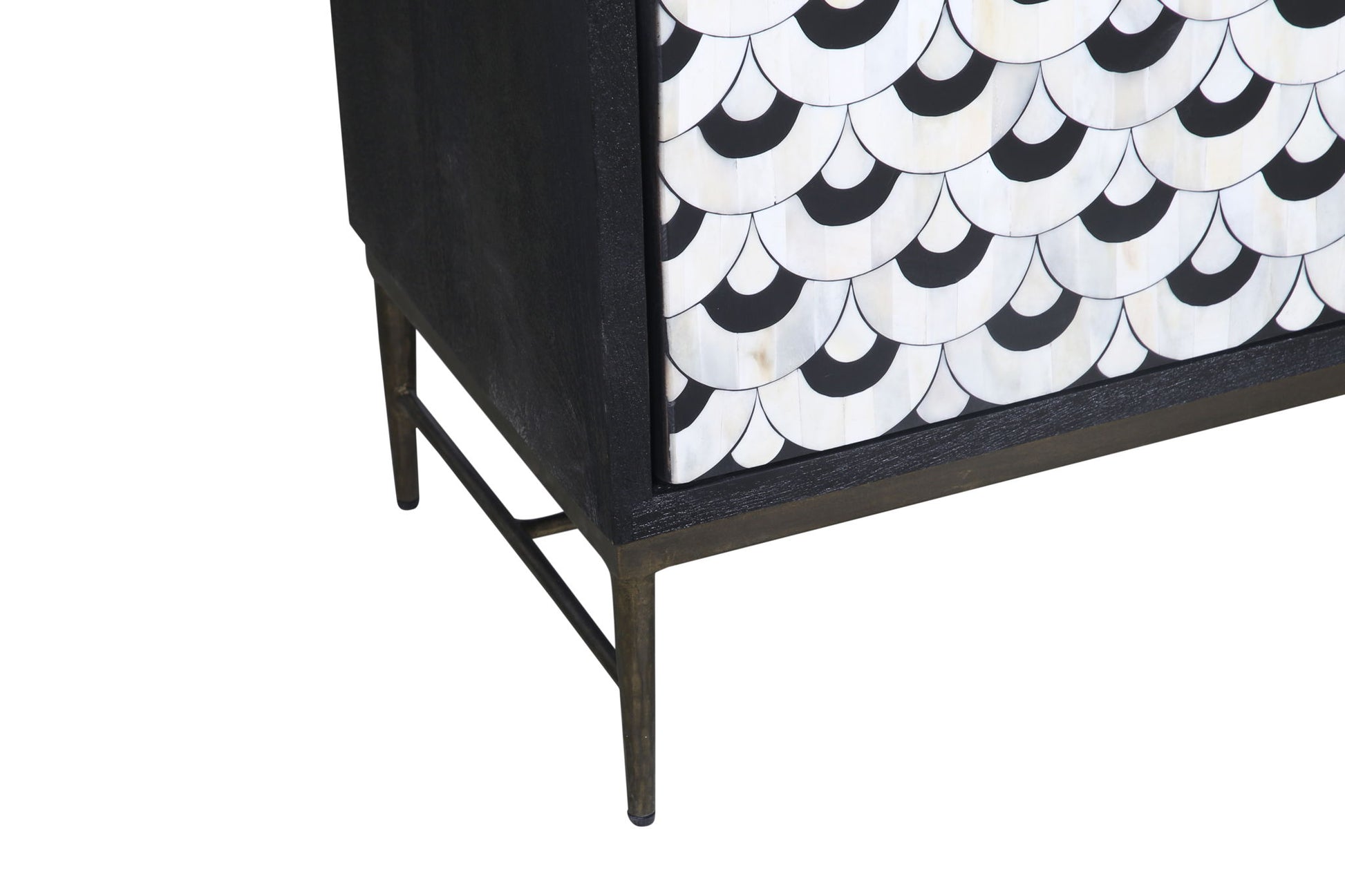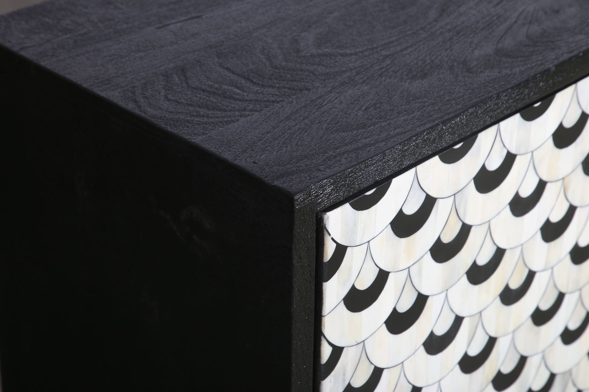 - The scalloped pattern on the doors features a striking contrast of ivory and black bone and resin