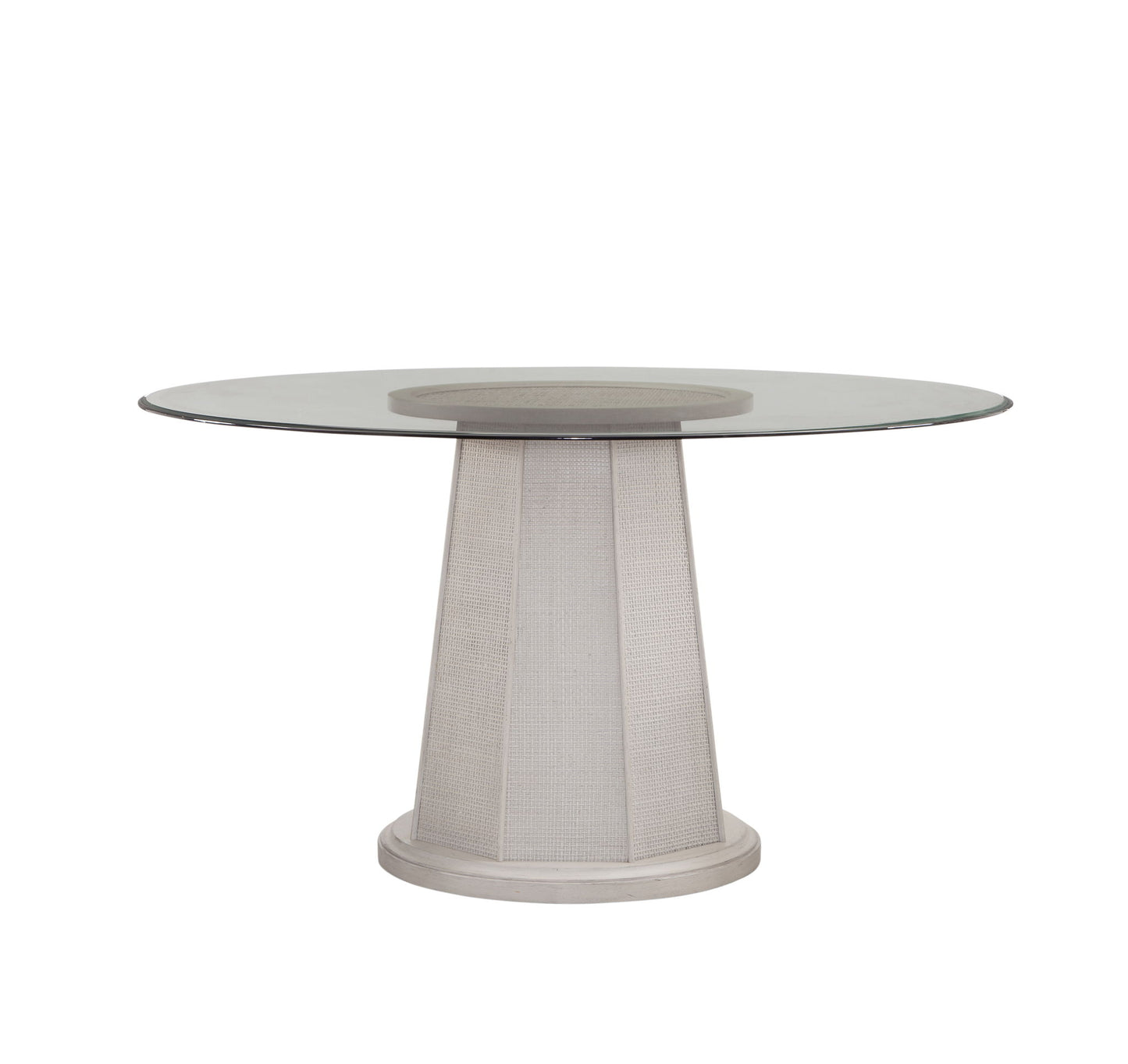 The Korey Round Dining Table seamlessly merges modern Boho and Coastal design elements. It features a tapered pedestal base and intricate box-weave cane detailing throughout, all finished in a neutral white-wash on mindi veneers. This table includes a 54" round glass top, making it a versatile addition to your dining space and providing comfortable seating for 4-6 adults. Crafted from high-quality rubberwood solids and select mindi veneers, it combines style and durability effortlessly.