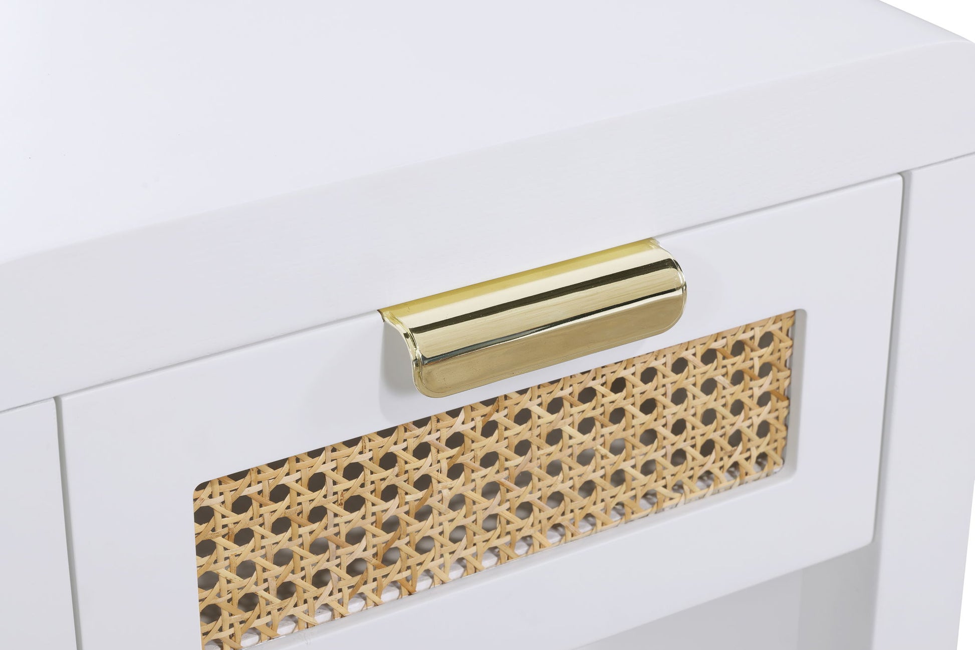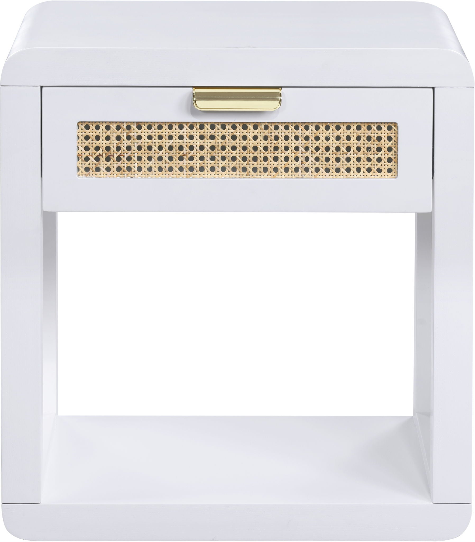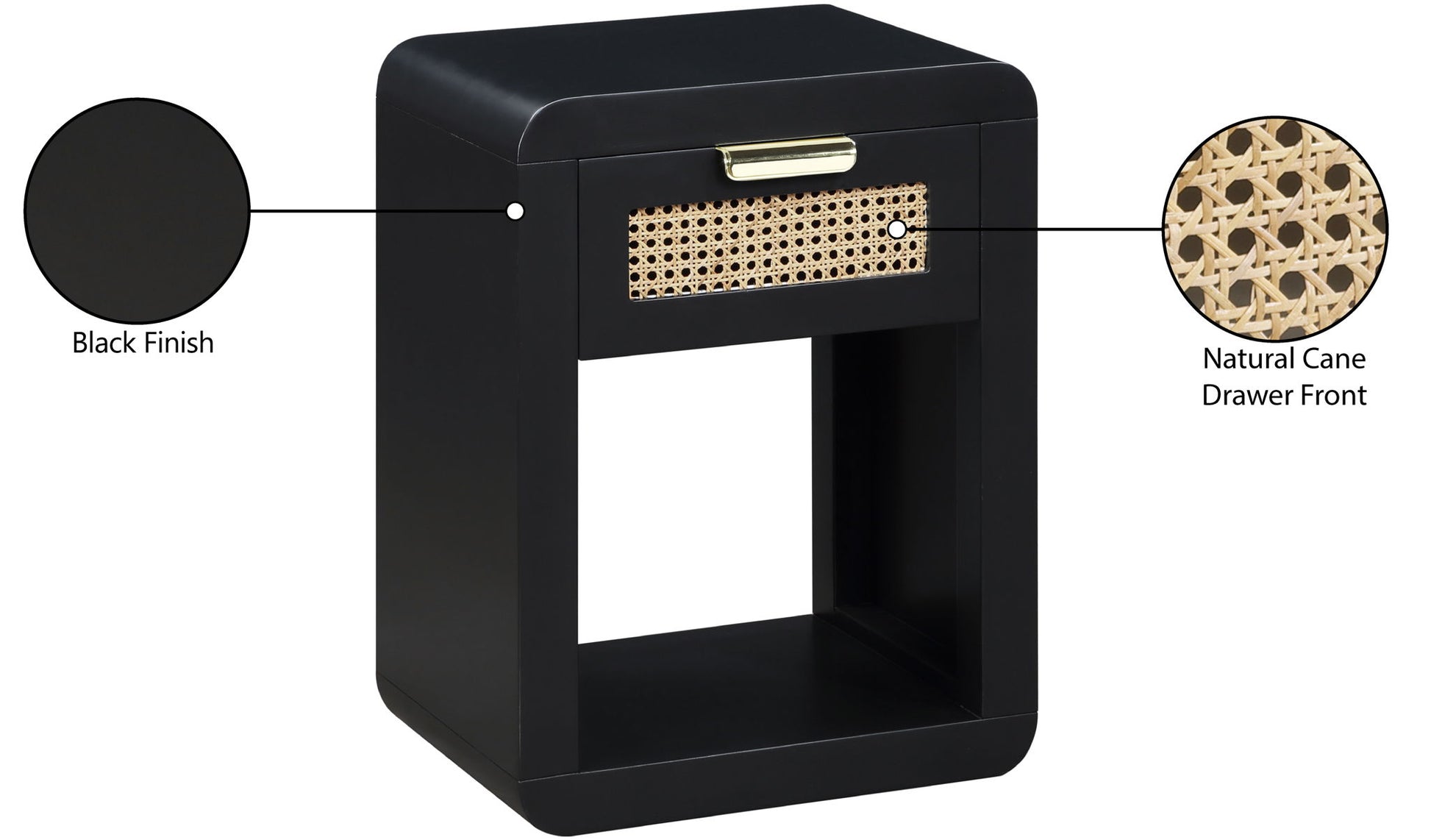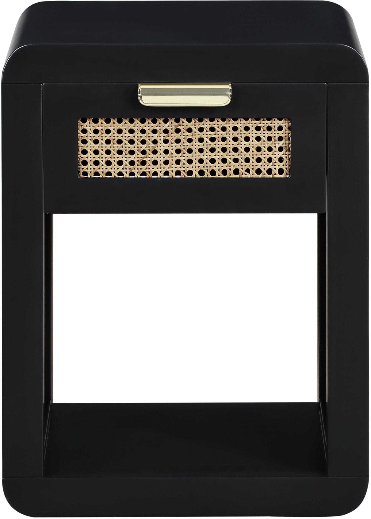 Lend your bedroom a distinctive touch with this Langham night stand from Meridian Furniture. Featuring an open, rectangular design and a natural cane drawer front, this night stand is truly unique. A sleek finish complements the existing decor in your bedroom; both brushed brass and handles are included so you can choose which one best matches your decor. This night stand s mid century design is the perfect addition to your living space.