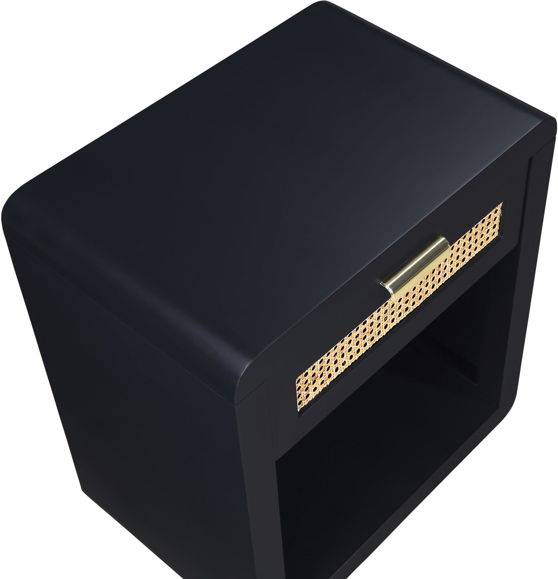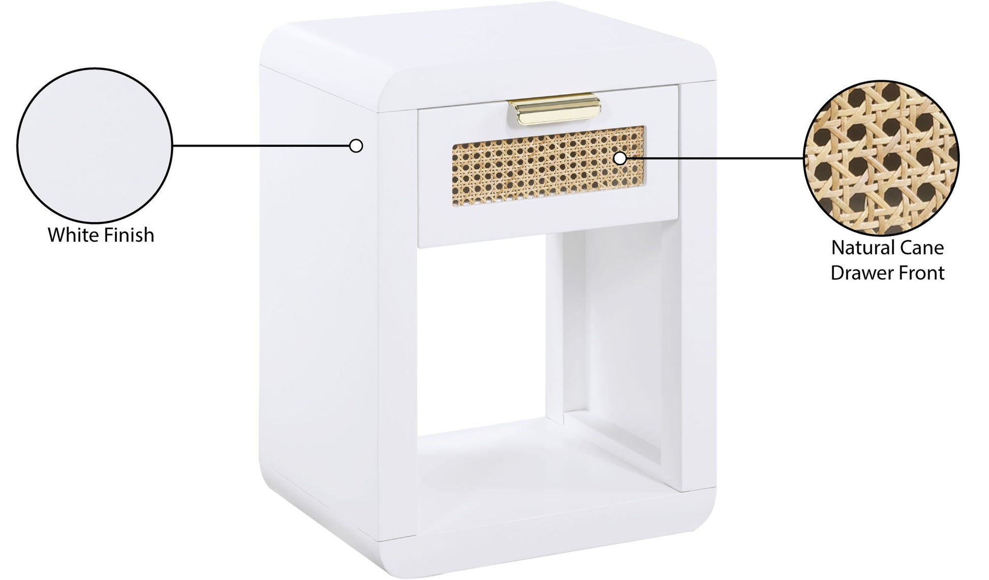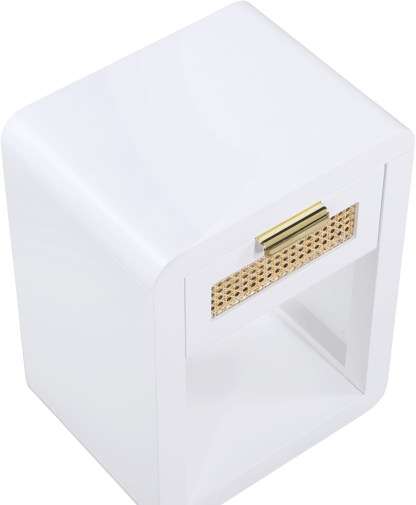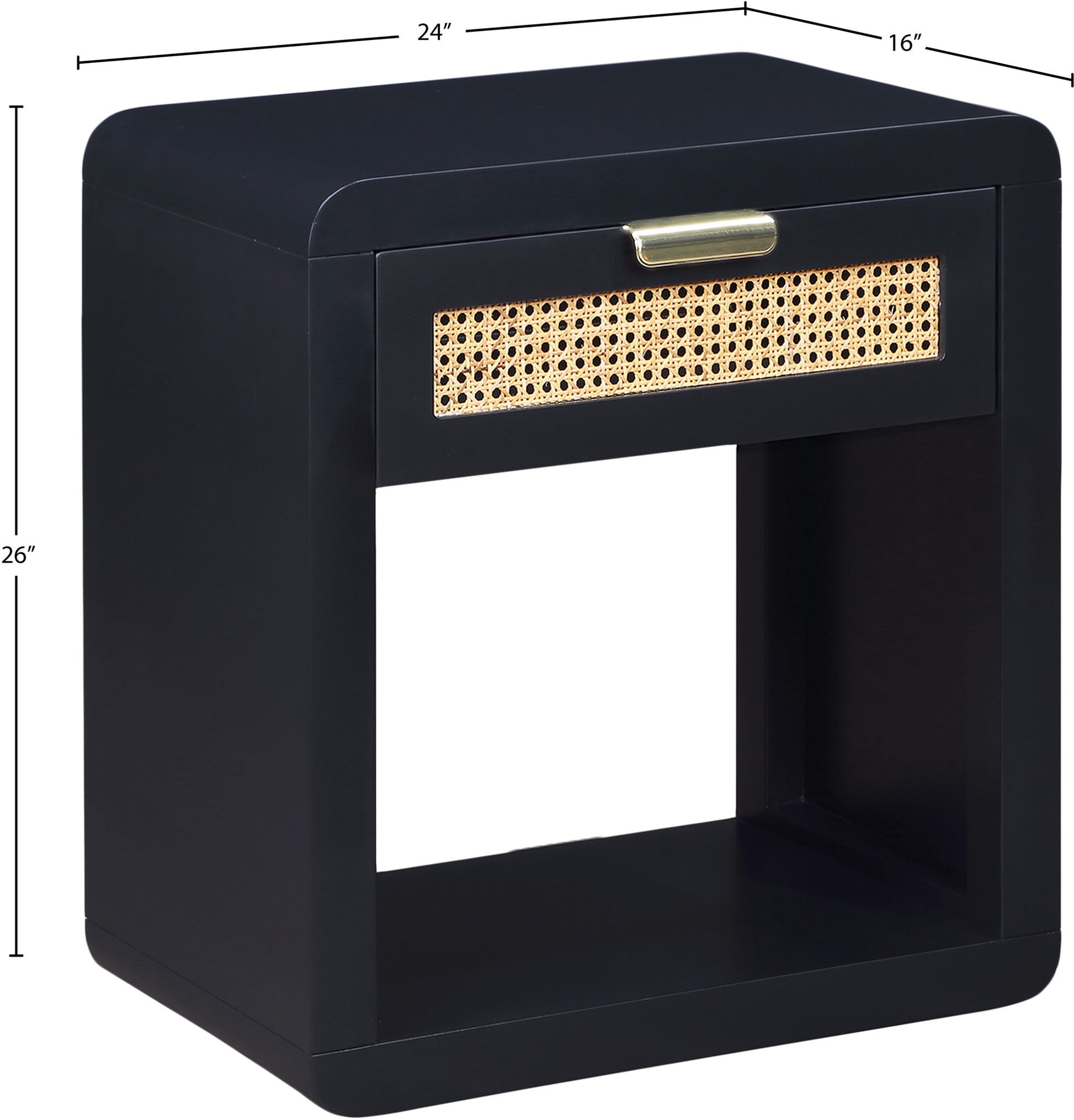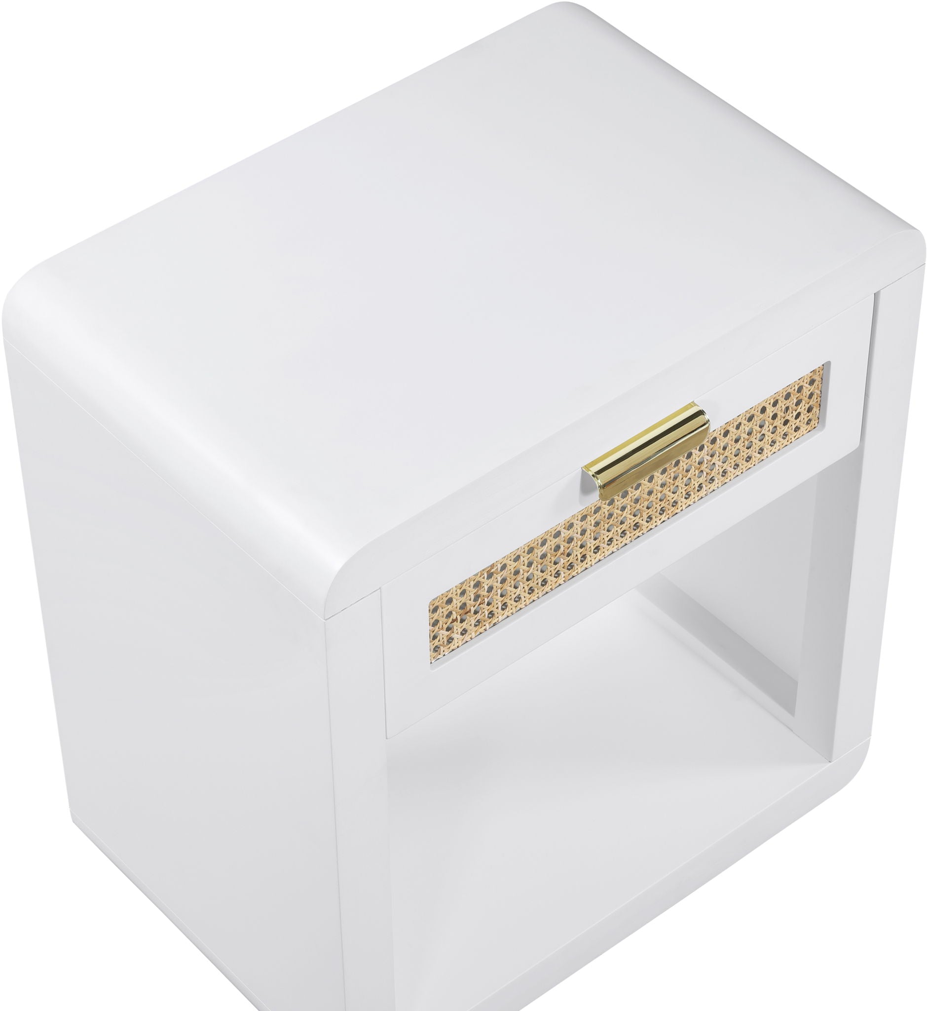 Lend your bedroom a distinctive touch with this Langham night stand from Meridian Furniture. Featuring an open, rectangular design and a natural cane drawer front, this night stand is truly unique. A sleek finish complements the existing decor in your bedroom; both brushed brass and handles are included so you can choose which one best matches your decor. This night stand s mid century design is the perfect addition to your living space.