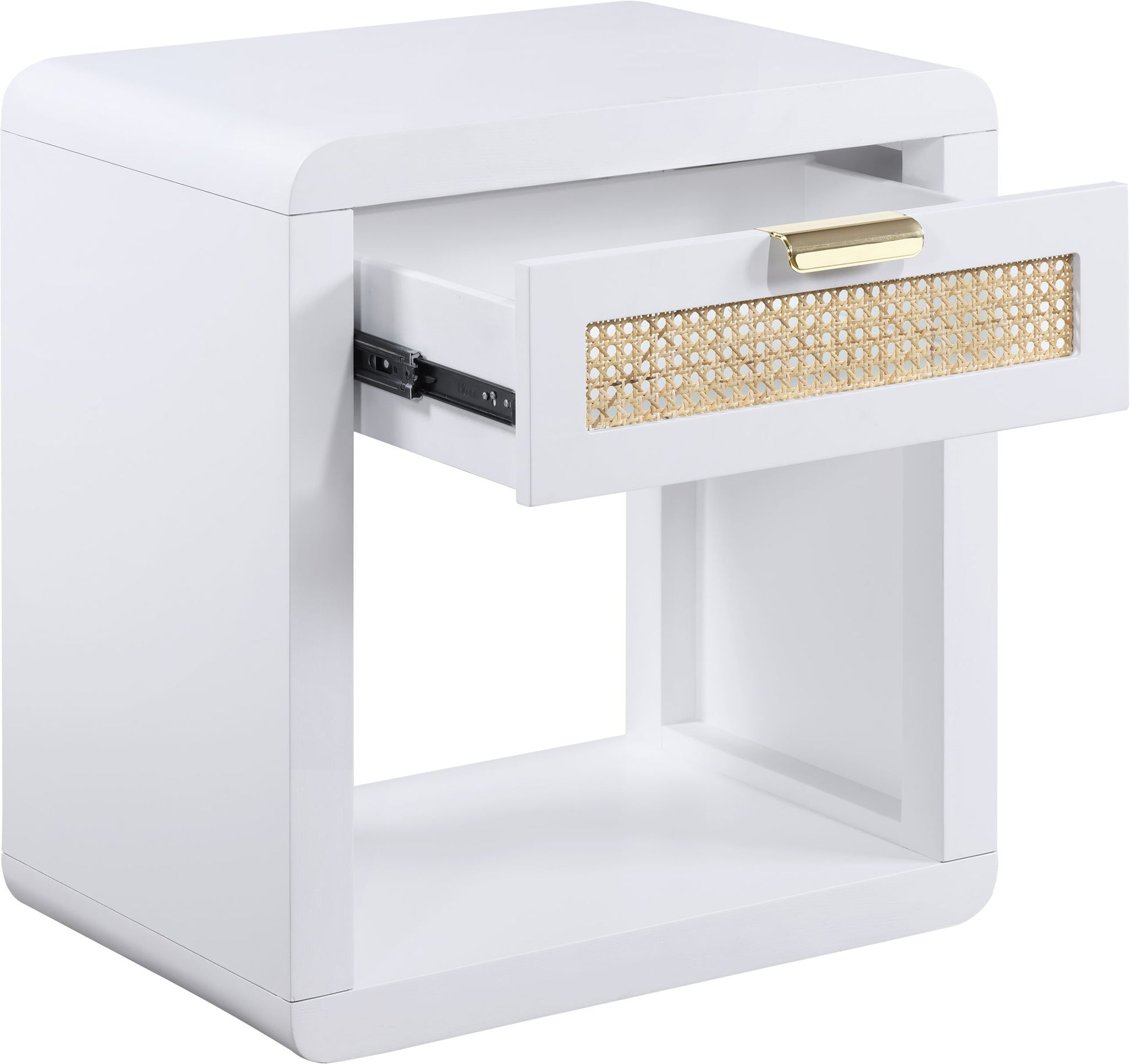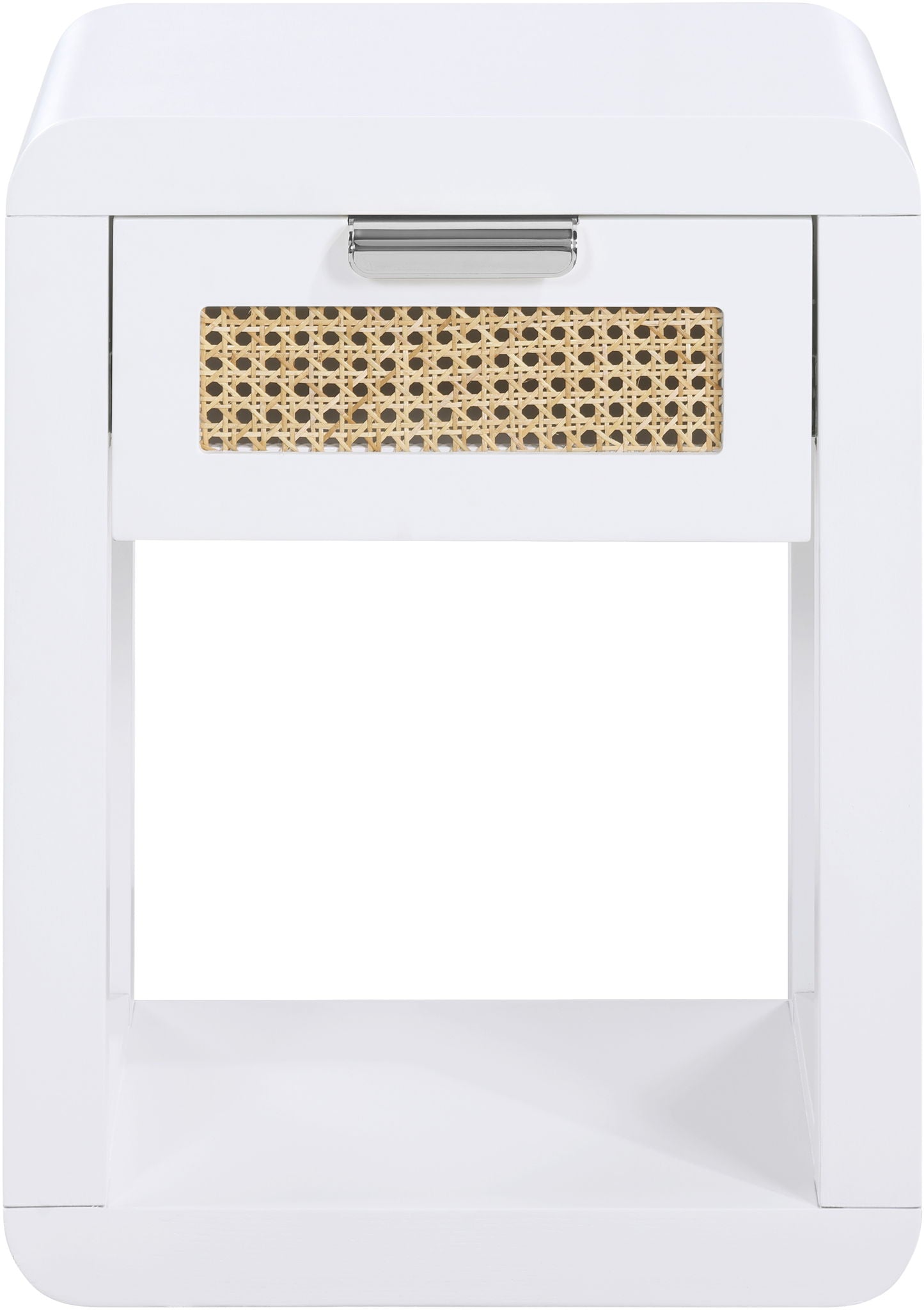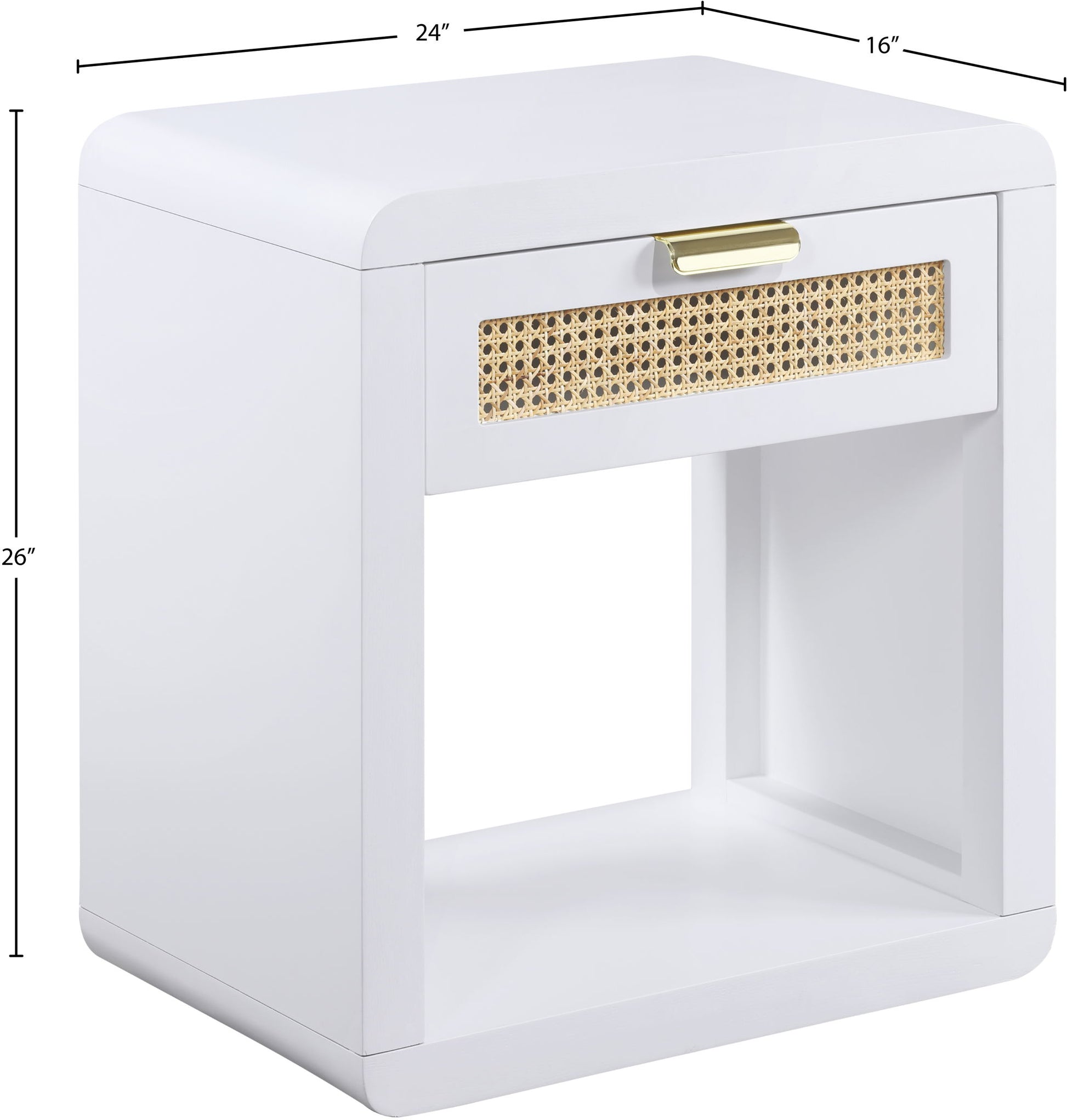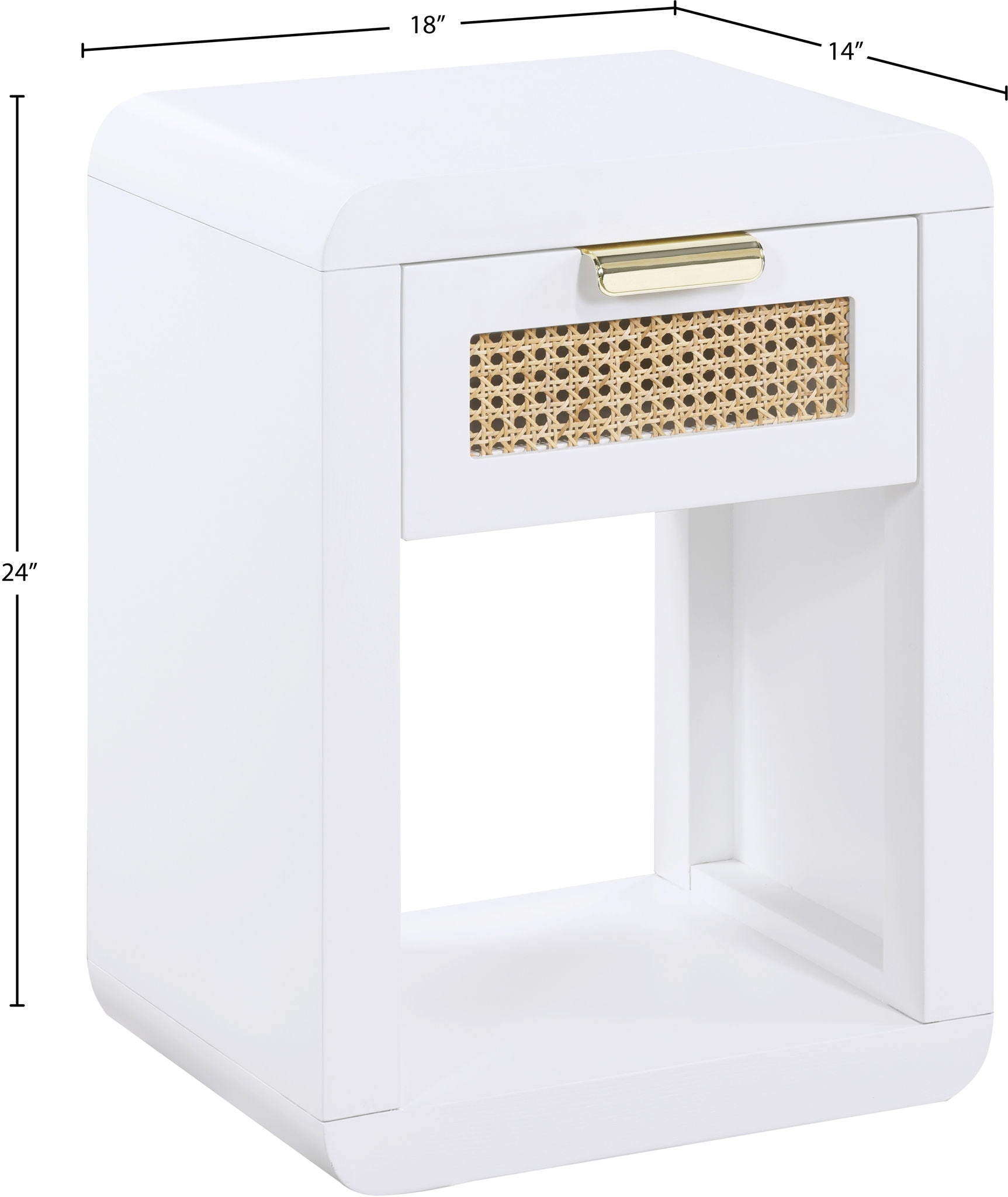 Lend your bedroom a distinctive touch with this Langham night stand from Meridian Furniture. Featuring an open, rectangular design and a natural cane drawer front, this night stand is truly unique. A sleek finish complements the existing decor in your bedroom; both brushed brass and handles are included so you can choose which one best matches your decor. This night stand s mid century design is the perfect addition to your living space.