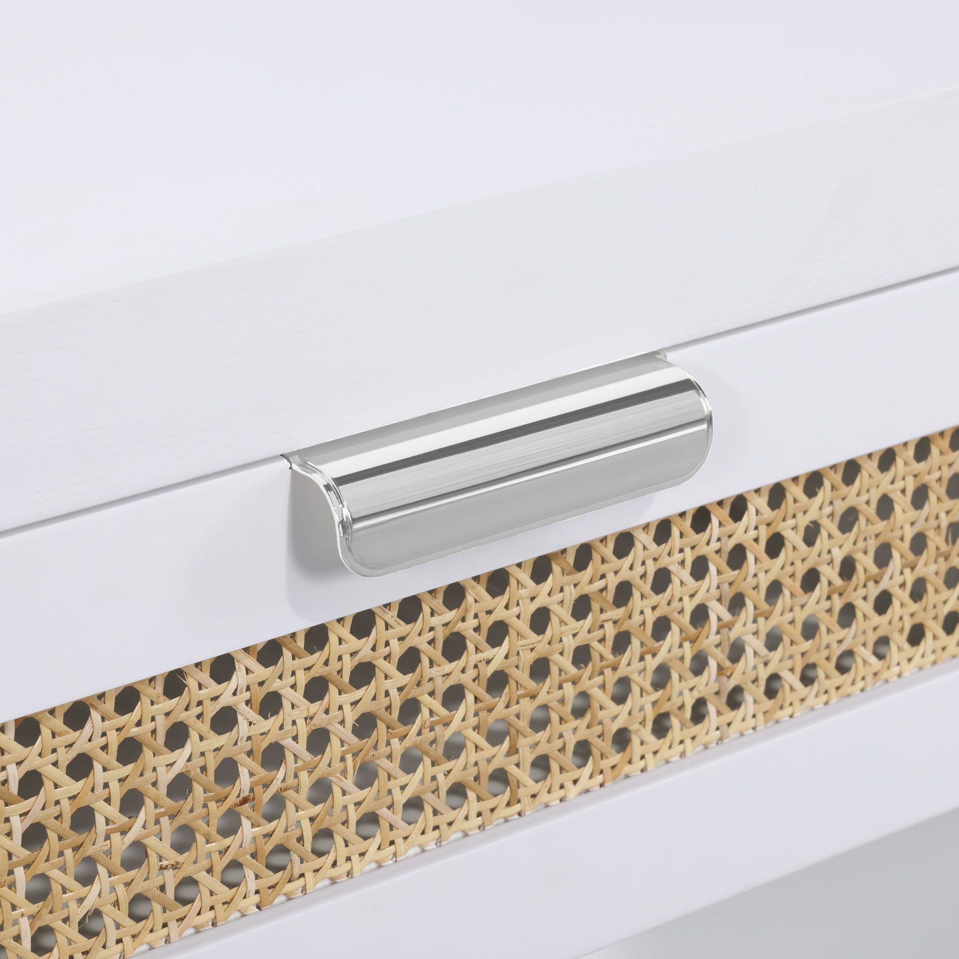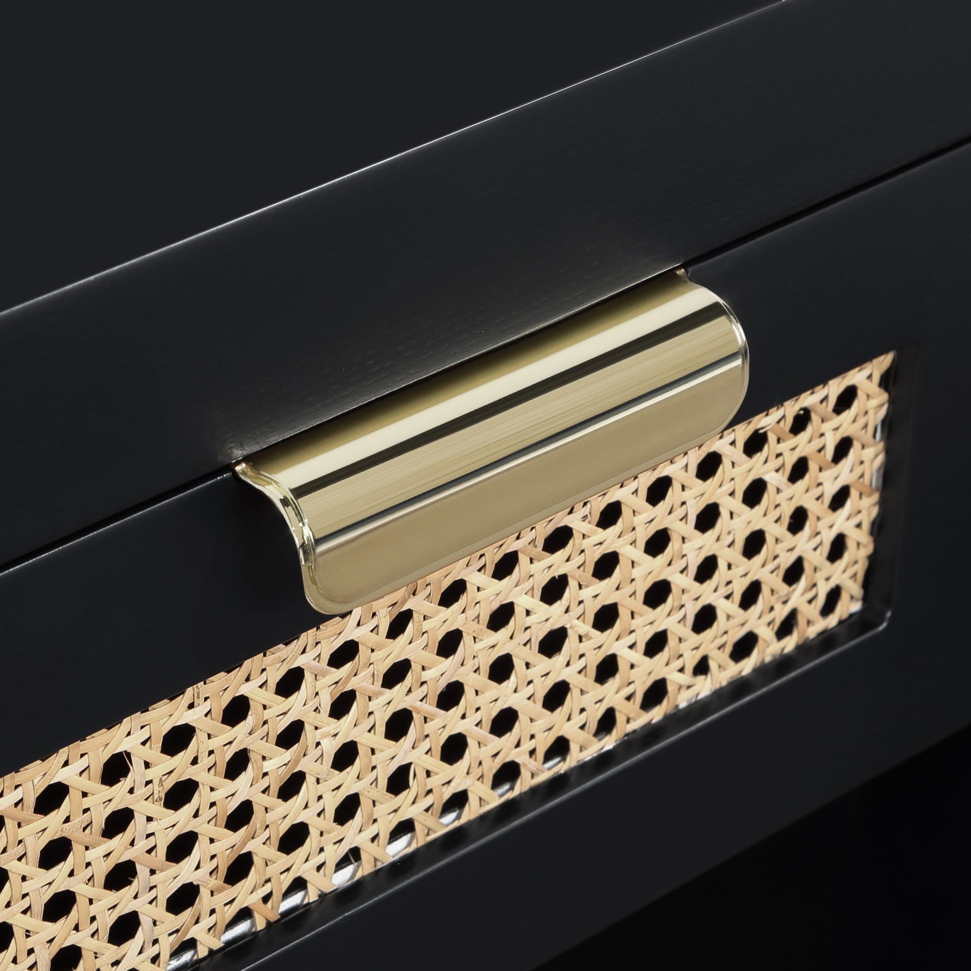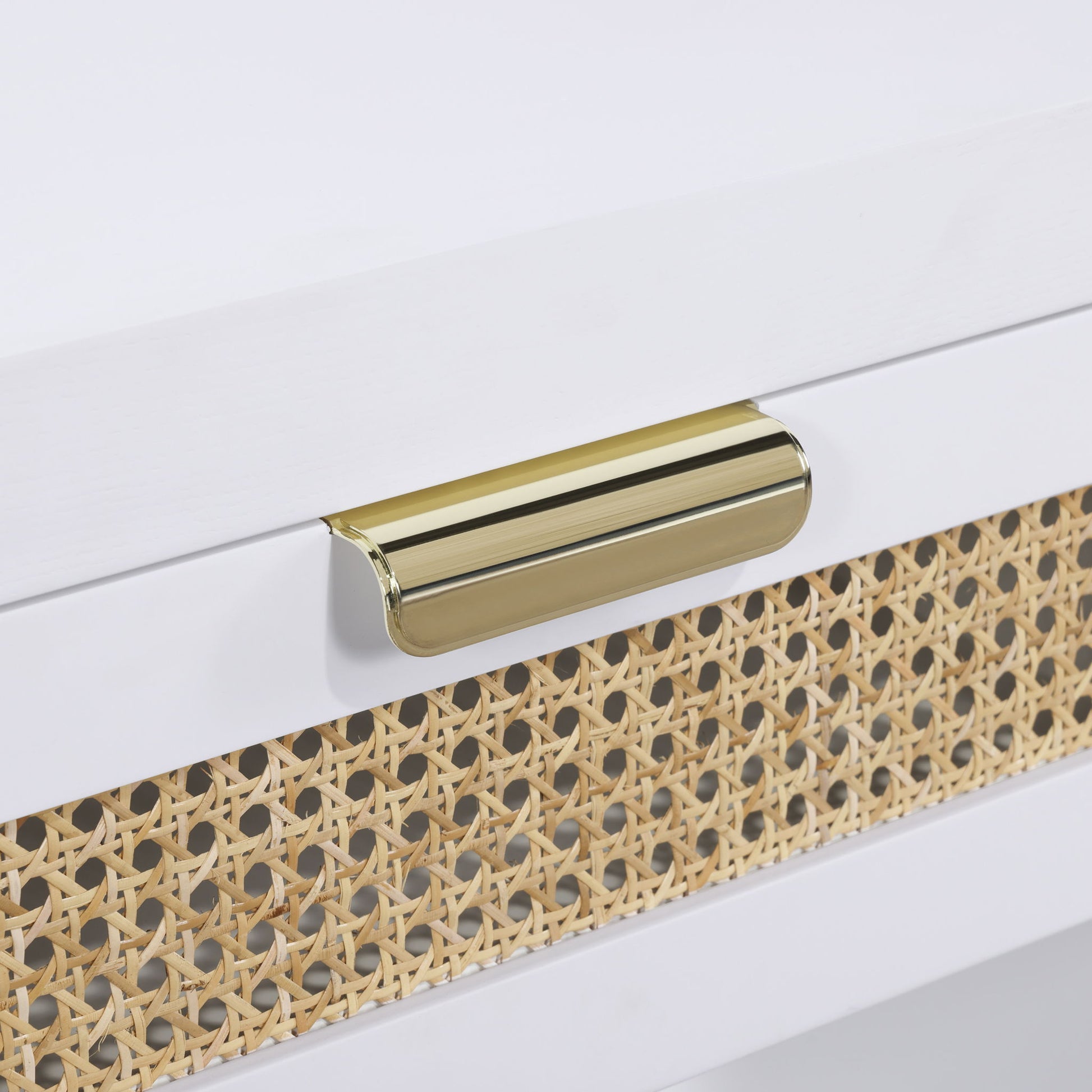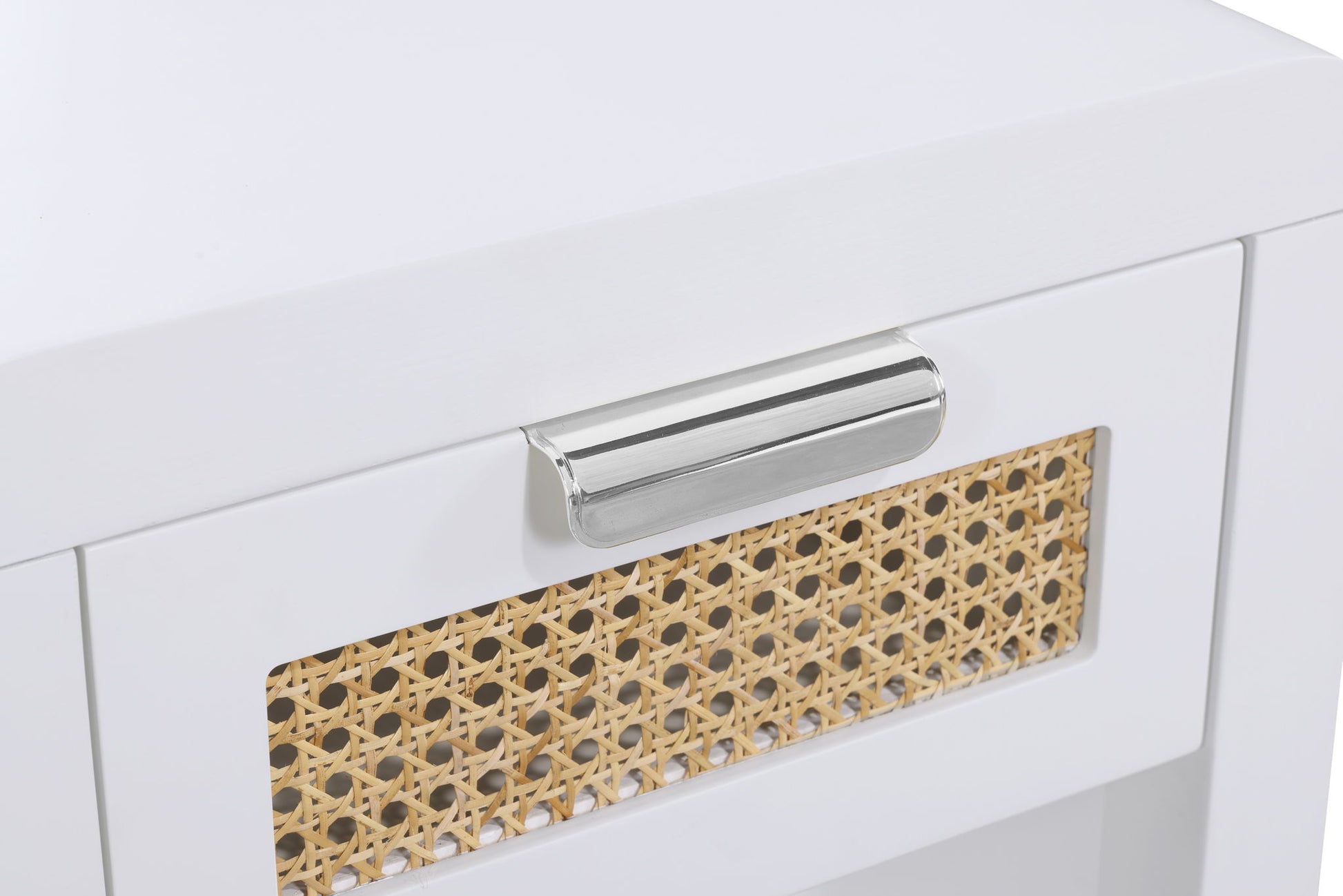 Lend your bedroom a distinctive touch with this Langham night stand from Meridian Furniture. Featuring an open, rectangular design and a natural cane drawer front, this night stand is truly unique. A sleek finish complements the existing decor in your bedroom; both brushed brass and handles are included so you can choose which one best matches your decor. This night stand s mid century design is the perfect addition to your living space.