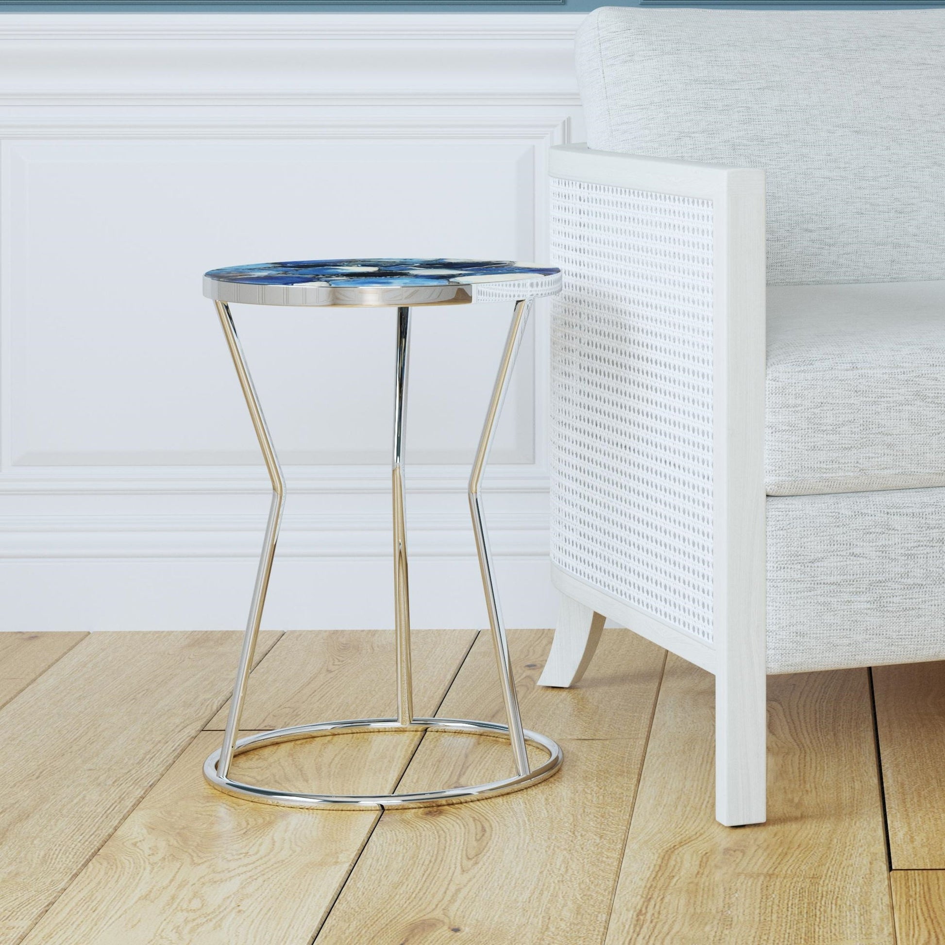 The Lauer Accent Table is perfectly scaled for a chairside table to display flowers and hold drinks. Features a blue agate stone top supported by a thin, silver stainless base.