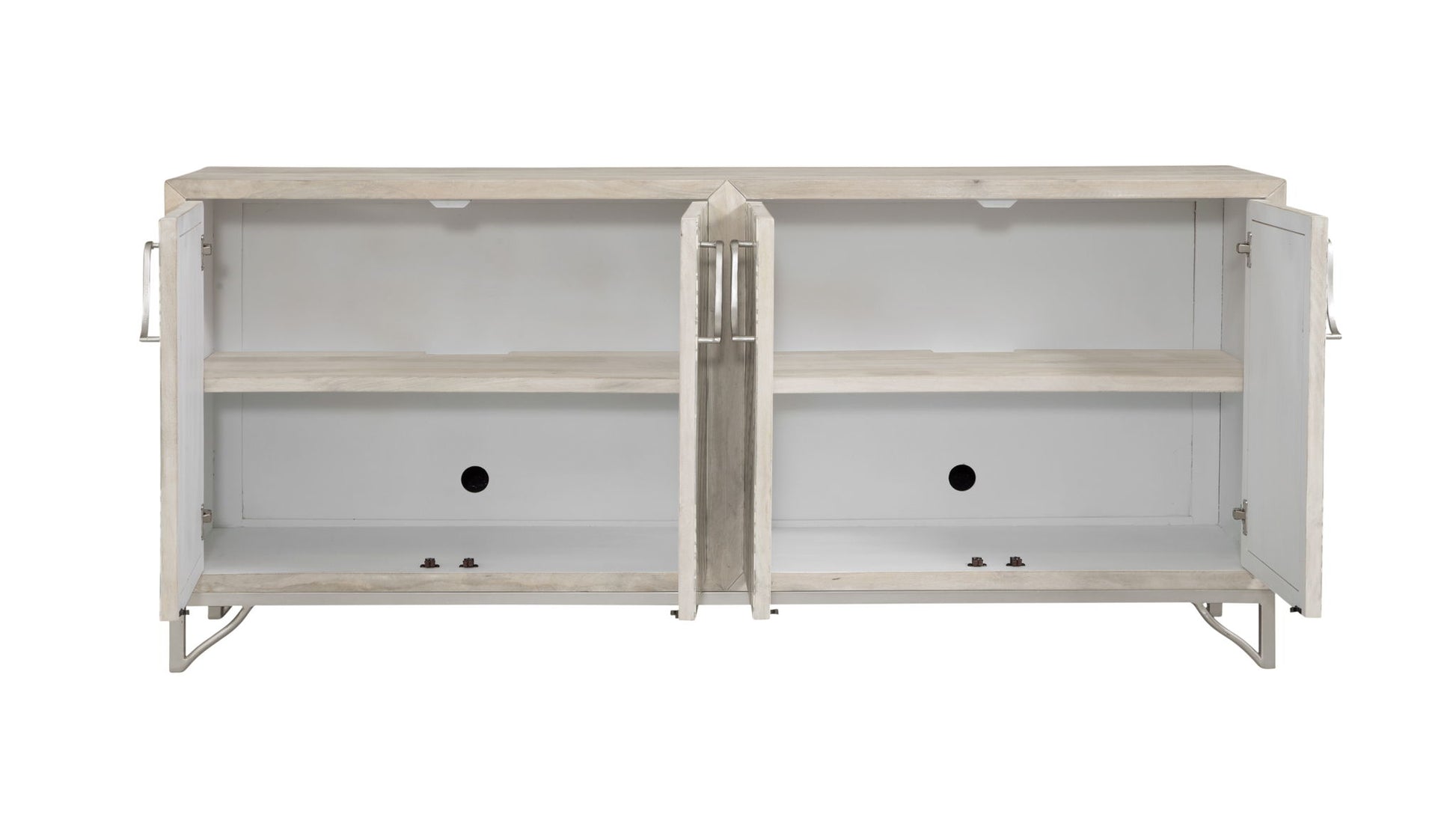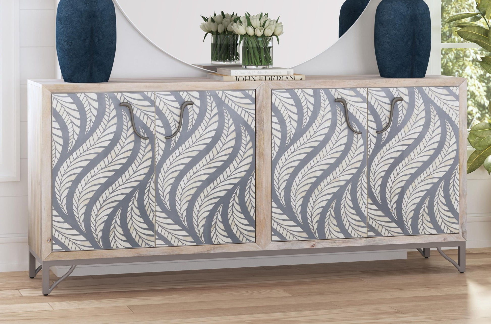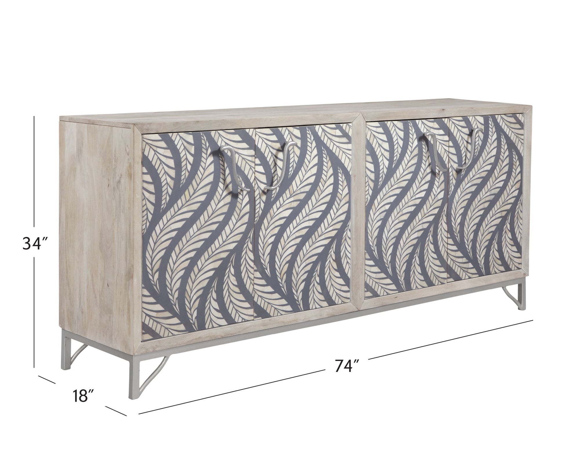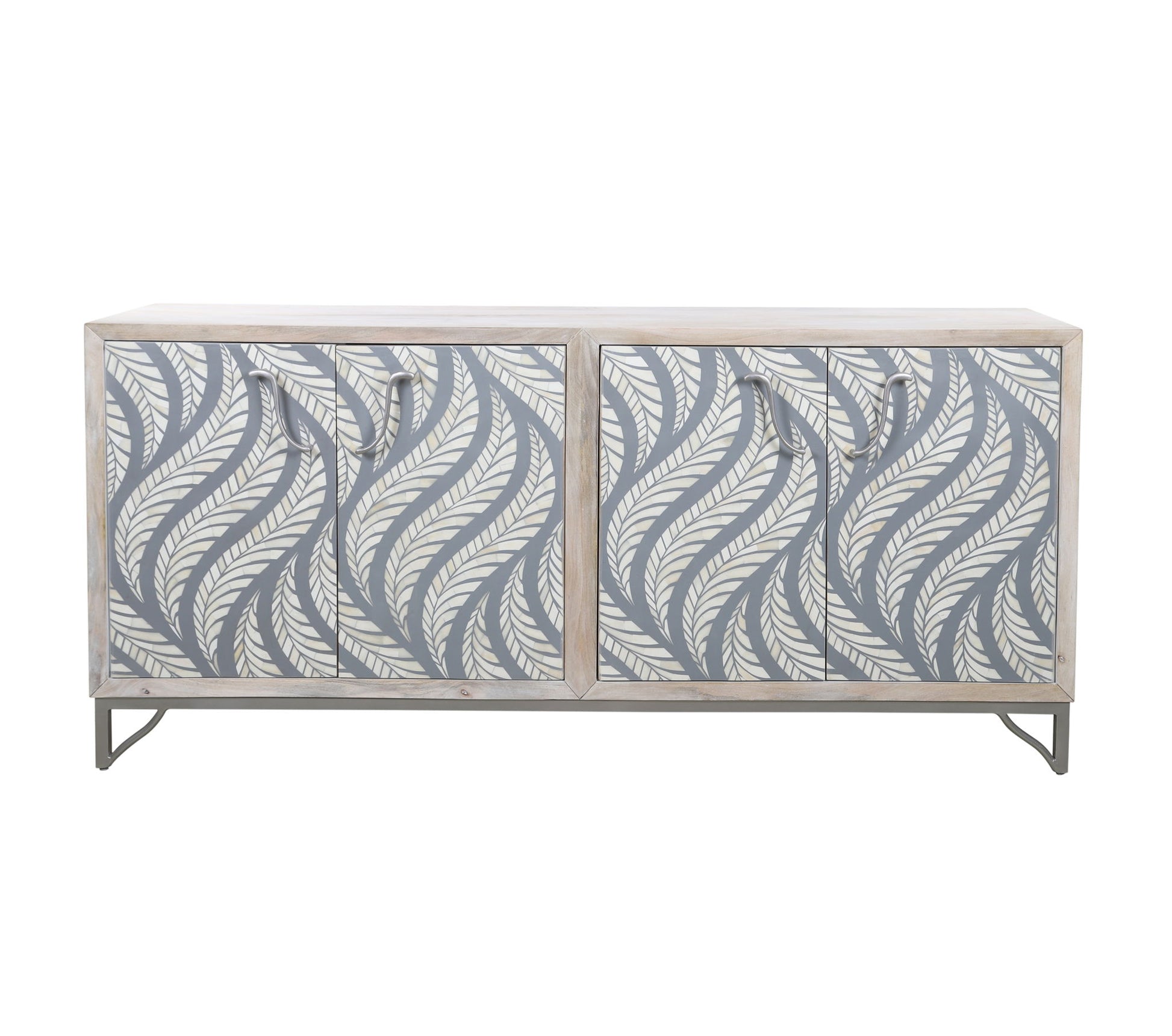 The Leia Server is a stunning modern piece, featuring a solid mango wood case frame finished in a light bleached tone. Its intricately patterned door fronts showcase hand-laid bone and light grey resin, reflecting exceptional craftsmanship. Custom iron hardware adds a touch of sophistication, while the cool pewter-finished base enhances its contemporary appeal. This server embodies bespoke design, making it a standout addition to any dining space. With its unique aesthetic, the Leia Server combines style and functionality effortlessly.