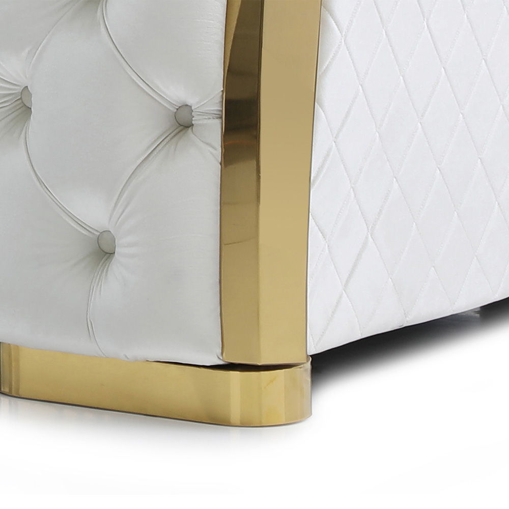 Introducing a stunning sofa that blends contemporary design with unmatched comfort, making it a focal point in any living space. The soft ivory velvet cover, accented with luxurious gold tone trim, elevates the overall style of your room. With generous measurements of 33"H x 90"W x 35"D, this piece welcomes family and guests to sit back and relax. Elegant button tufting at the back and arms not only enhances visual appeal but also provides a plush feel that supports your back during casual gatherings. The diamond quilted exterior adds a sophisticated texture, combining durability with a chic look, ensuring that your furniture stands out. The thoughtfully designed welted seam cushions help maintain shape and structure over time, ensuring continued comfort during use. This sofa is further complemented by contrasting faux fur throw pillows, which invite you to snuggle up and enjoy a cozy evening, making it a fantastic addition to your living room decor.