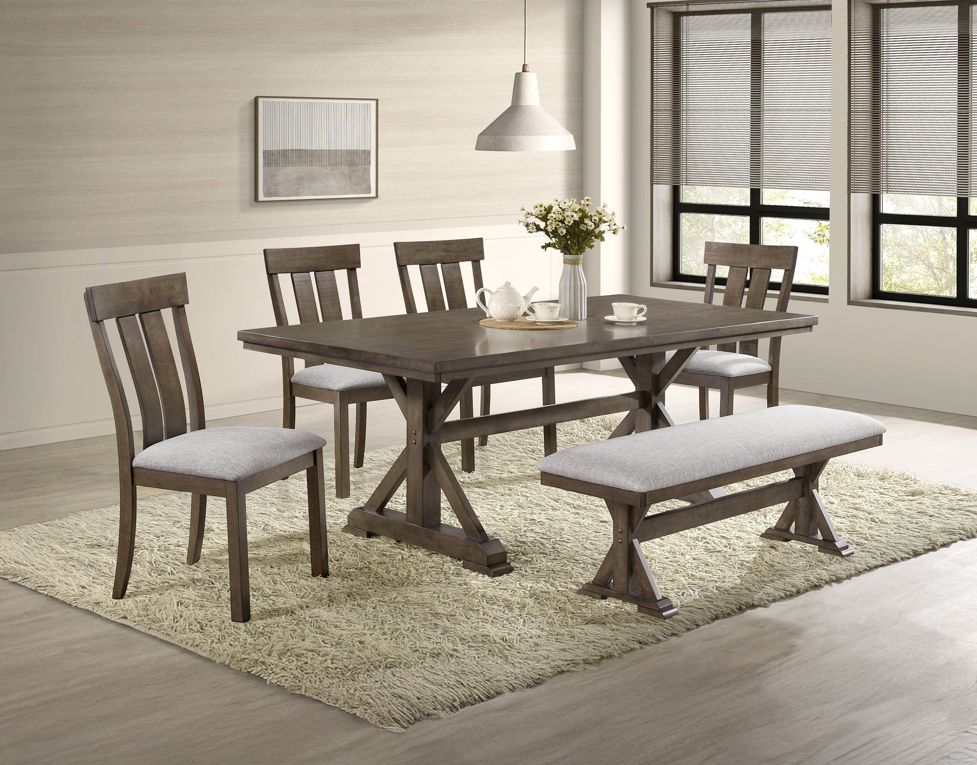 Bring rustic elegance to your dining space with this stunning farmhouse-inspired dining set, designed for both style and functionality. The beautifully crafted table features a robust trestle base, adding character and durability, while its rich wood finish enhances the natural charm of your home. The matching chairs and bench showcase a sleek slat-back design with plush upholstered seating, ensuring comfort for every gathering. Perfect for casual family meals or formal entertaining, this collection effortlessly blends rustic warmth with contemporary sophistication, making it a timeless centerpiece for any dining room.