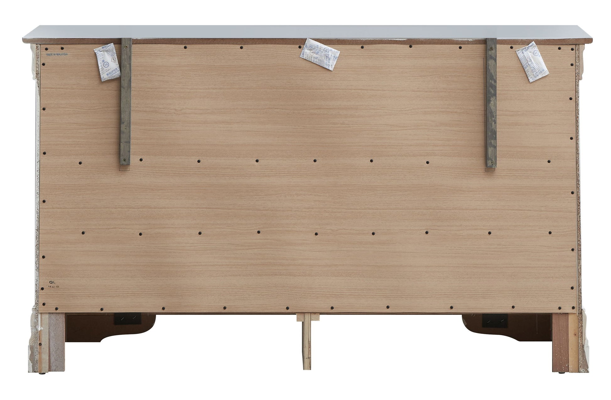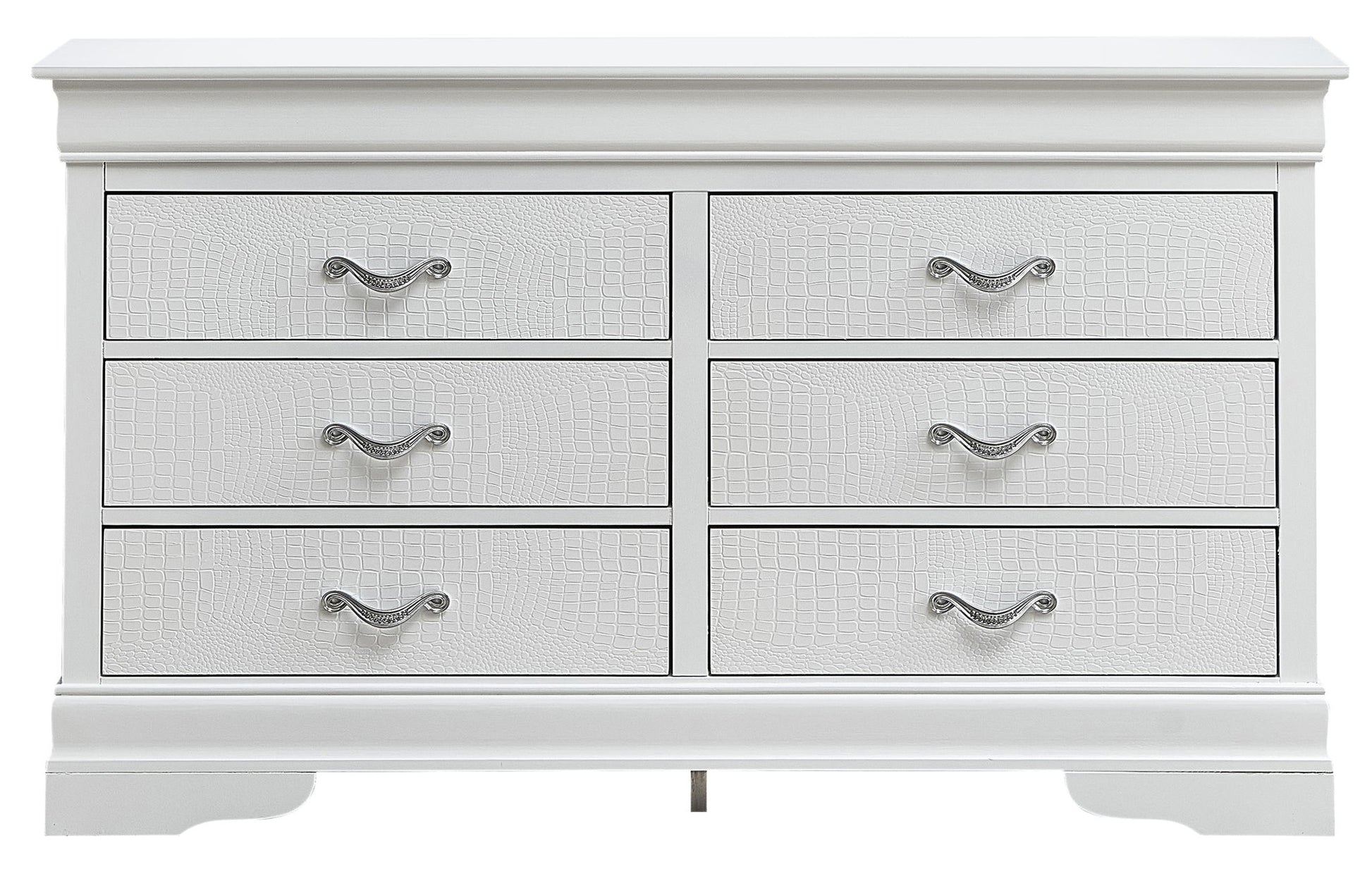 Enhance your bedroom aesthetic with the Silver Champagne Croc Finish dresser, tailored to blend effortlessly with various design styles. This piece features a striking silver champagne croc finish that brings a modern touch to your space. Crafted with premium wood veneers, this dresser not only contributes to the charm of your decor but also ensures lasting durability, making it a practical choice for everyday use. With dimensions of 33" in height, 59" in width, and 16" in depth, the dresser offers ample storage for clothing and accessories while fitting beautifully in both small and spacious rooms alike. The sleek, contemporary design elevates your organization, turning storage into a refined aspect of your home. Featuring smooth-operating drawers, this dresser provides convenient access to your belongings, all while showcasing a unique style that enriches your bedroom. Additionally, the collection provides options for various bed sizes, ensuring a cohesive and inviting ambiance throughout your sanctuary.