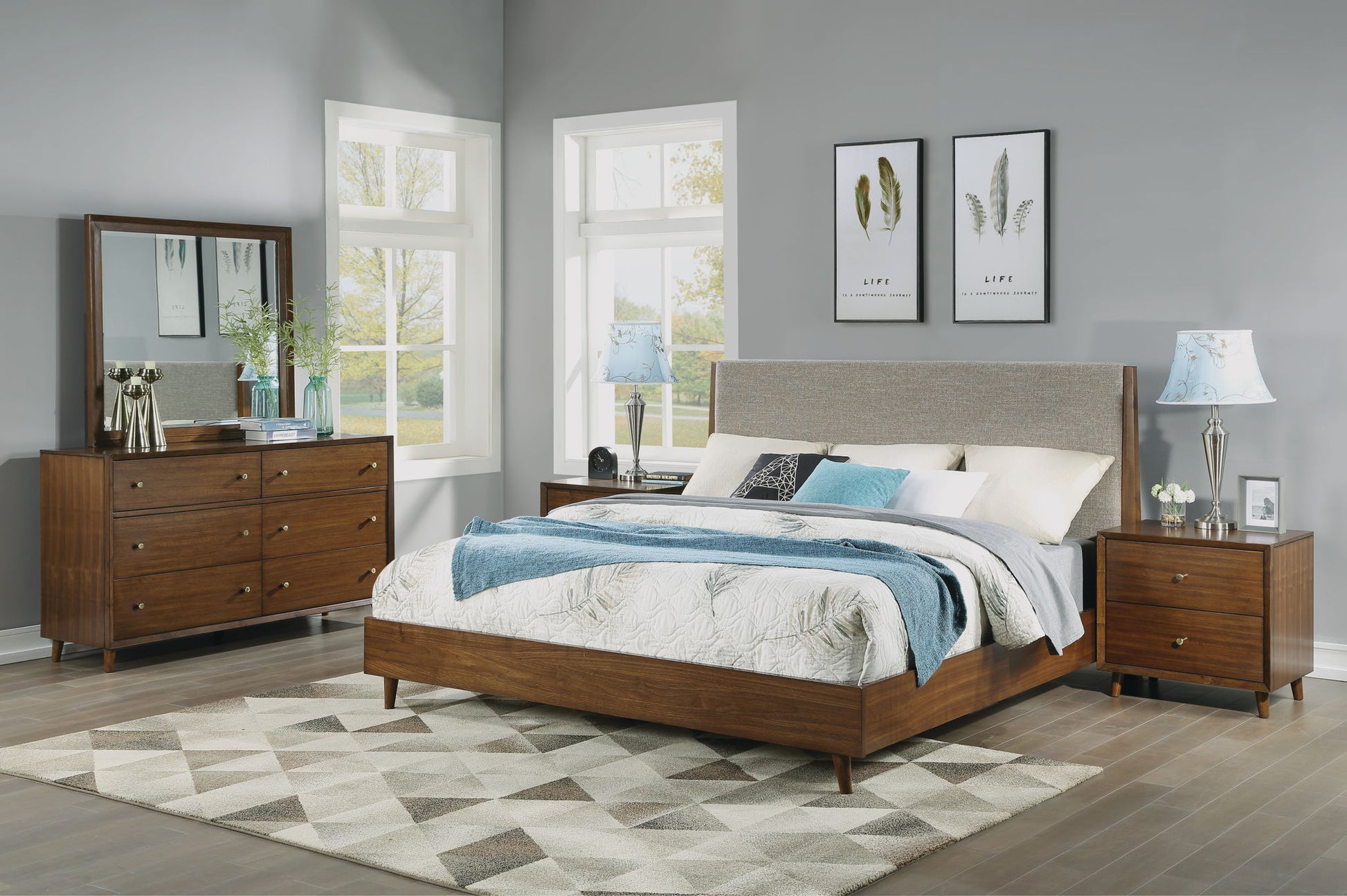Timeless Simplicity Slumber in sophistication with this Ludwig king bed which features a sleek, upholstered headboard in a silt-colored fabric to harmoniously blend with any décor. Anchored with clean lines and tapered, splayed legs in classic mid-century styling, this bed is accentuated by a warm, walnut finish and chamfered edges for a sophisticated look. Also available in sizes from full to California King, the bed is smaller scaled to perfectly fit in any size bedroom. Timeless design and high-quality construction ensure the Ludwig bed can be enjoyed for generations to come.