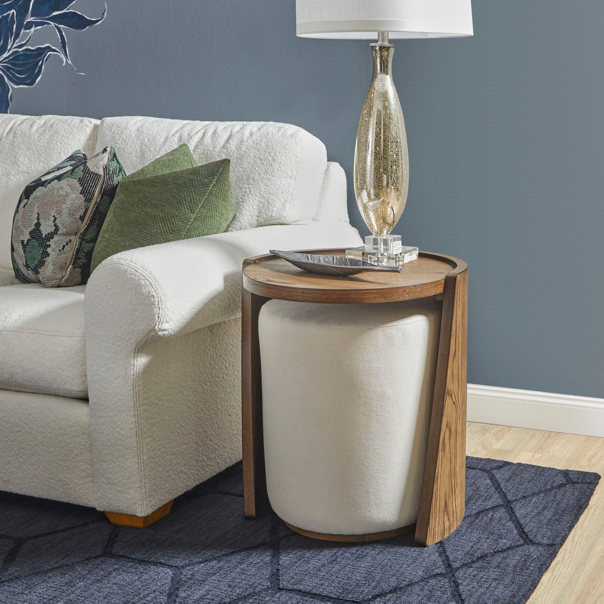 All the modern luxury you need, with natural, organic influences. Lyra is the perfect combination of nature and innovation. This end table hugs the accompanying pouf for easy storage and a visually appealing combination. The pouf is upholstered in cloud-soft ivory performance fabric that stands up to everyday wear. The perfect blend of contemporary and natural, Lyra elevates your space into the modern age, and still feels down-to-earth.