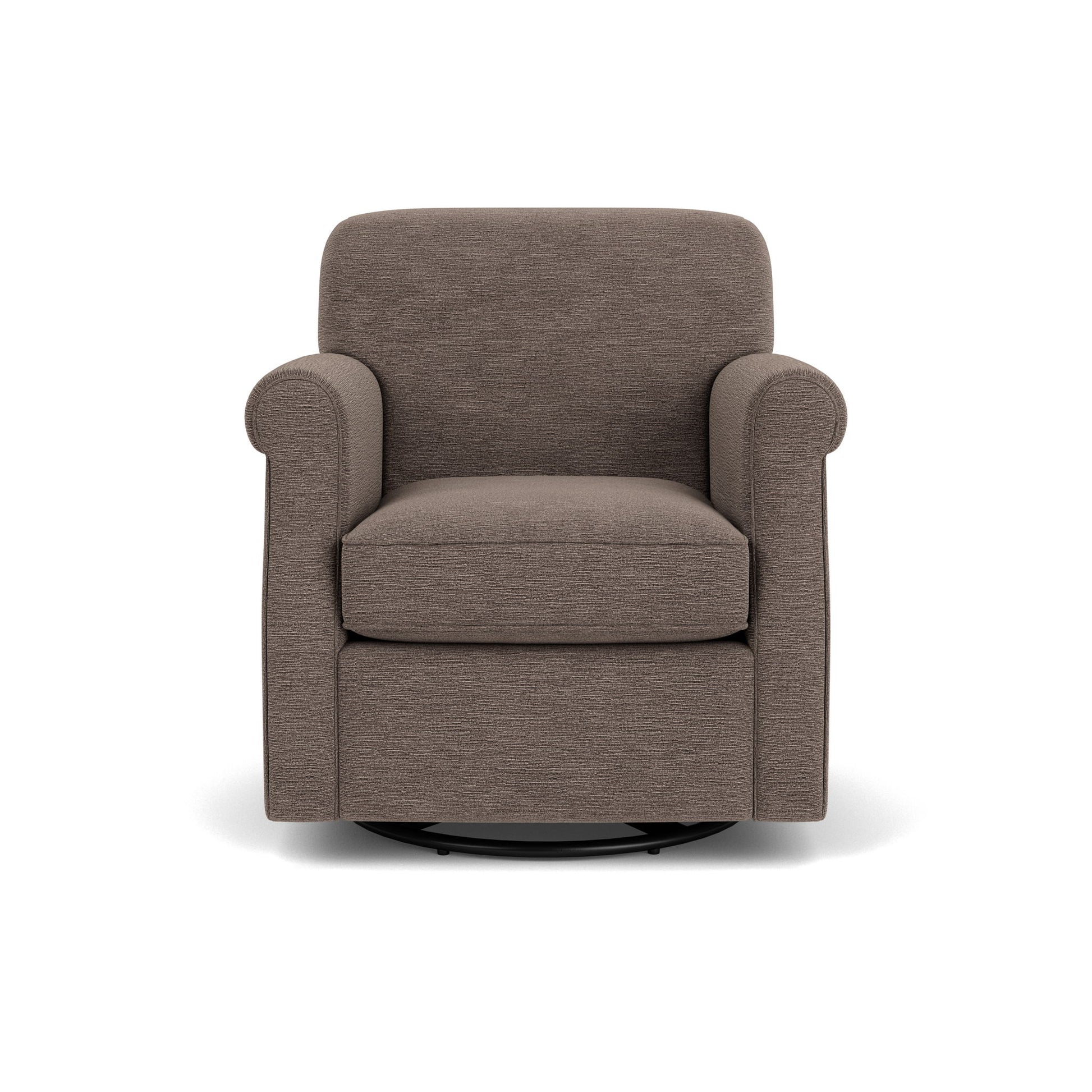 Mabel’s simple structure gives way to a rounded tight back cushion and traditional rolled arms. Welt cording outlines the arm fronts and seat cushion for a clean look, and its ability to swivel makes it an irresistibly fun, casual piece.