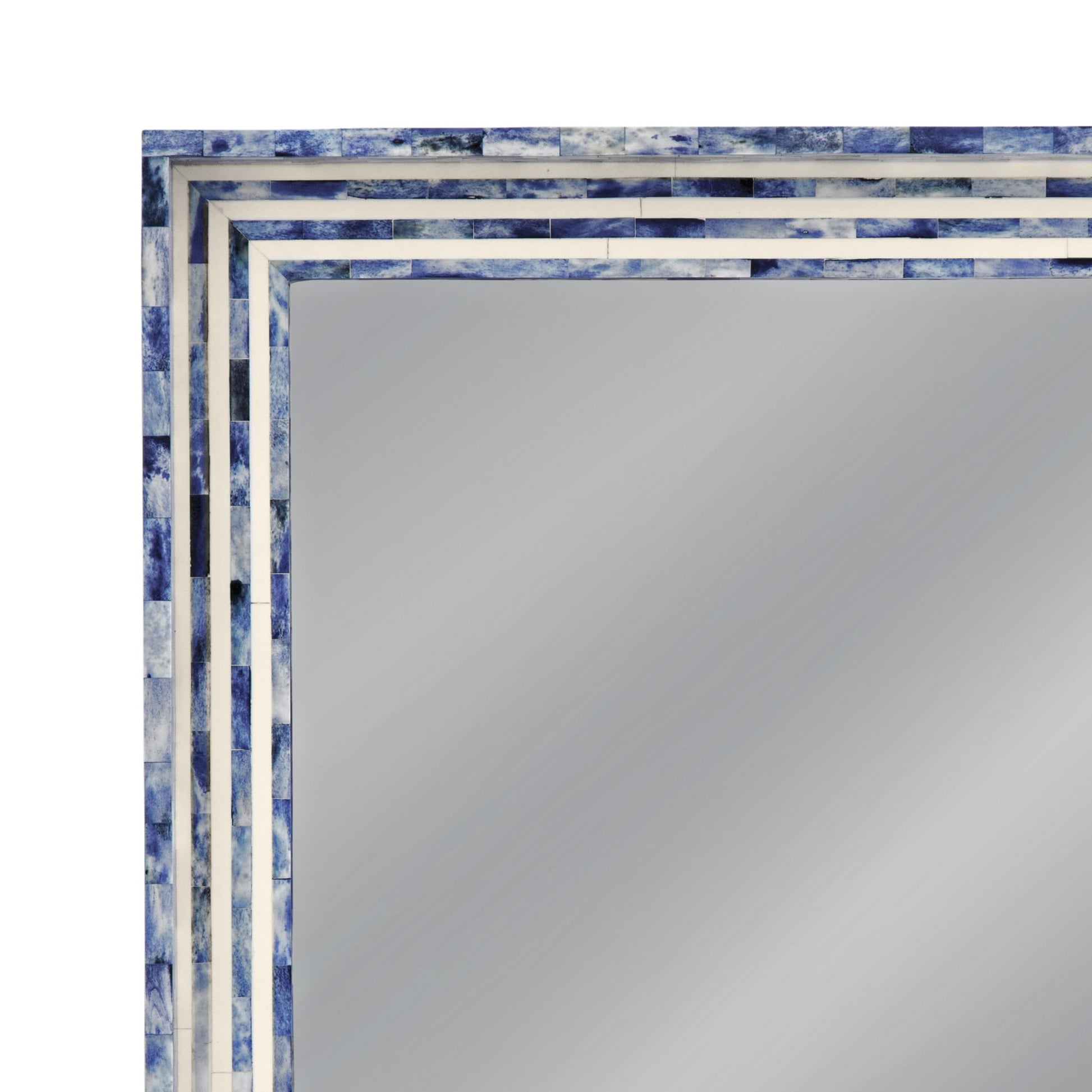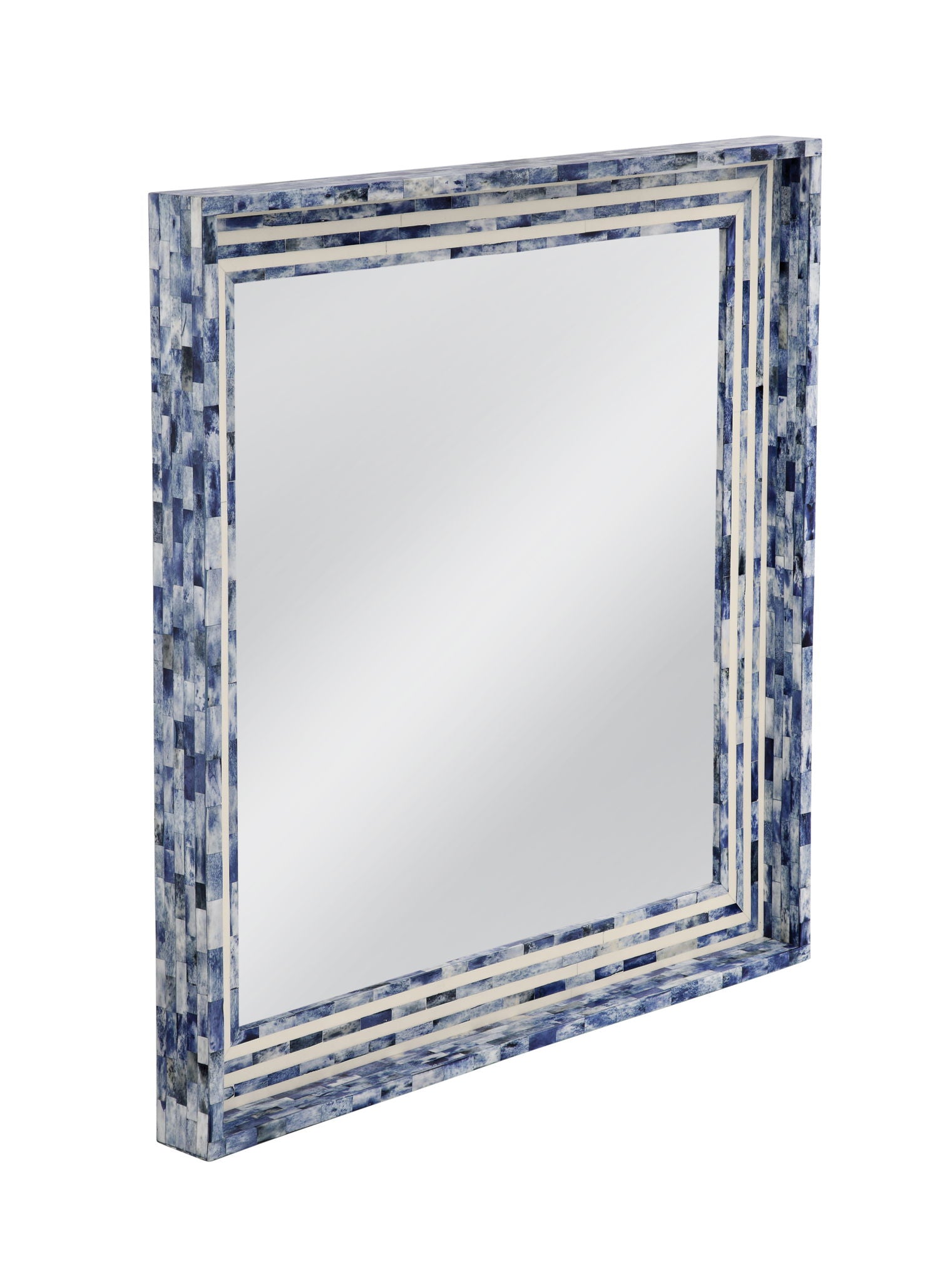 The Mabrey Wall Mirror exudes a boho-coastal vibe with its charming square design and striking blue and cream bone frame. This unique piece adds a touch of artisanal flair to your space, creating a relaxed and inviting atmosphere. Crafted with care and attention to detail, it serves as both a functional mirror and a stylish statement piece for any room in your home.