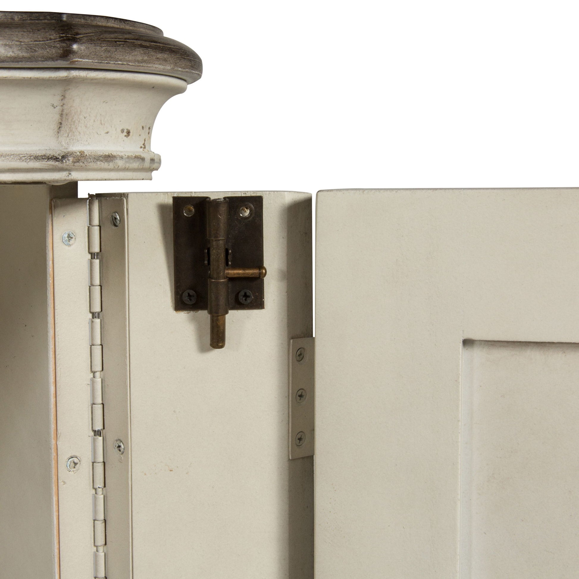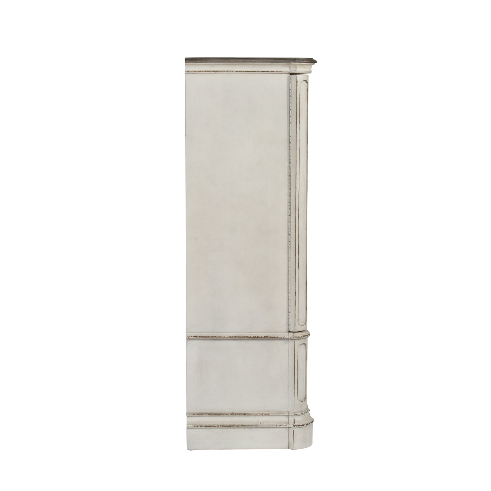 This door chest is the perfect way to accent your room with an effortless blend of European Traditional design. Weathered brown whitewash top paired with the antique white finish creates a truly unique look. Softness is added to the design with canted corners and rounded pilasters, accompanied by bead molding on each drawer front. The chest features 1 fully stained interior drawer, 3 pull out trays, 3 adjustable shelves and is framed by two wrap around doors.