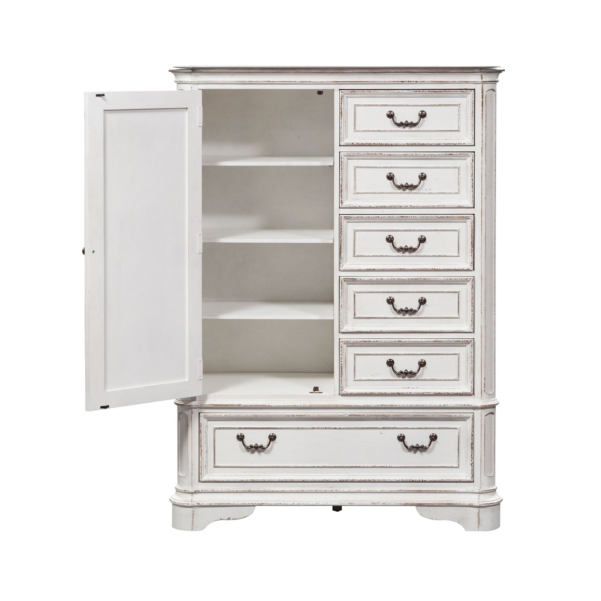 This master chest is the perfect way to accent your room with an effortless blend of European Traditional design. Weathered brown whitewash top paired with the antique white finish creates a truly unique look. Softness is added to the design with canted corners and rounded pilasters, accompanied by bead molding on each drawer front. The chest features 1 large and 5 smaller fully stained interior drawers, as well as 3 adjustable shelves behind the door, accented by custom antique pewter bail and knob hardware.